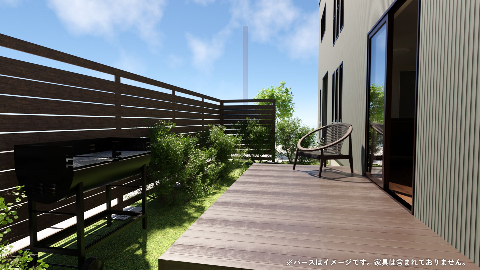 敷地は80坪超。プライベートガーデンでは泥んこ遊びや夏のプール、冬の雪遊び、BBQなど、家族や友人と四季を通じて楽しむことが可能です。LDKにつながるデッキは、家族が自然と集まる憩いの空間となります。