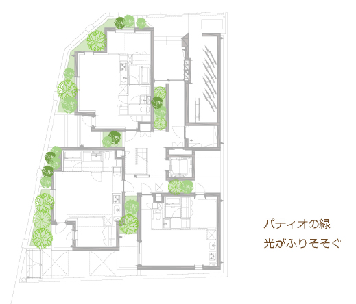 基本設計は株式会社佐野健太建築設計事務所、設計協力は株式会社杉浦建築設計事務所に依頼し、緑豊かな周辺環境の魅力を活かし、光と風を感じられる物件としていただきました。住戸間にスリット状の吹き抜けを設ける特徴的な構造により、住戸ごとに独立性を持たせながら、共用部にも光と風を導く快適な住環境を実現しています。また、全住戸を角部屋とすることでリビング・寝室に採光をとるとともに、1階の中庭に配した豊かな緑が吹き抜けを通じて上階からも感じられる心地よい空間が広がります。