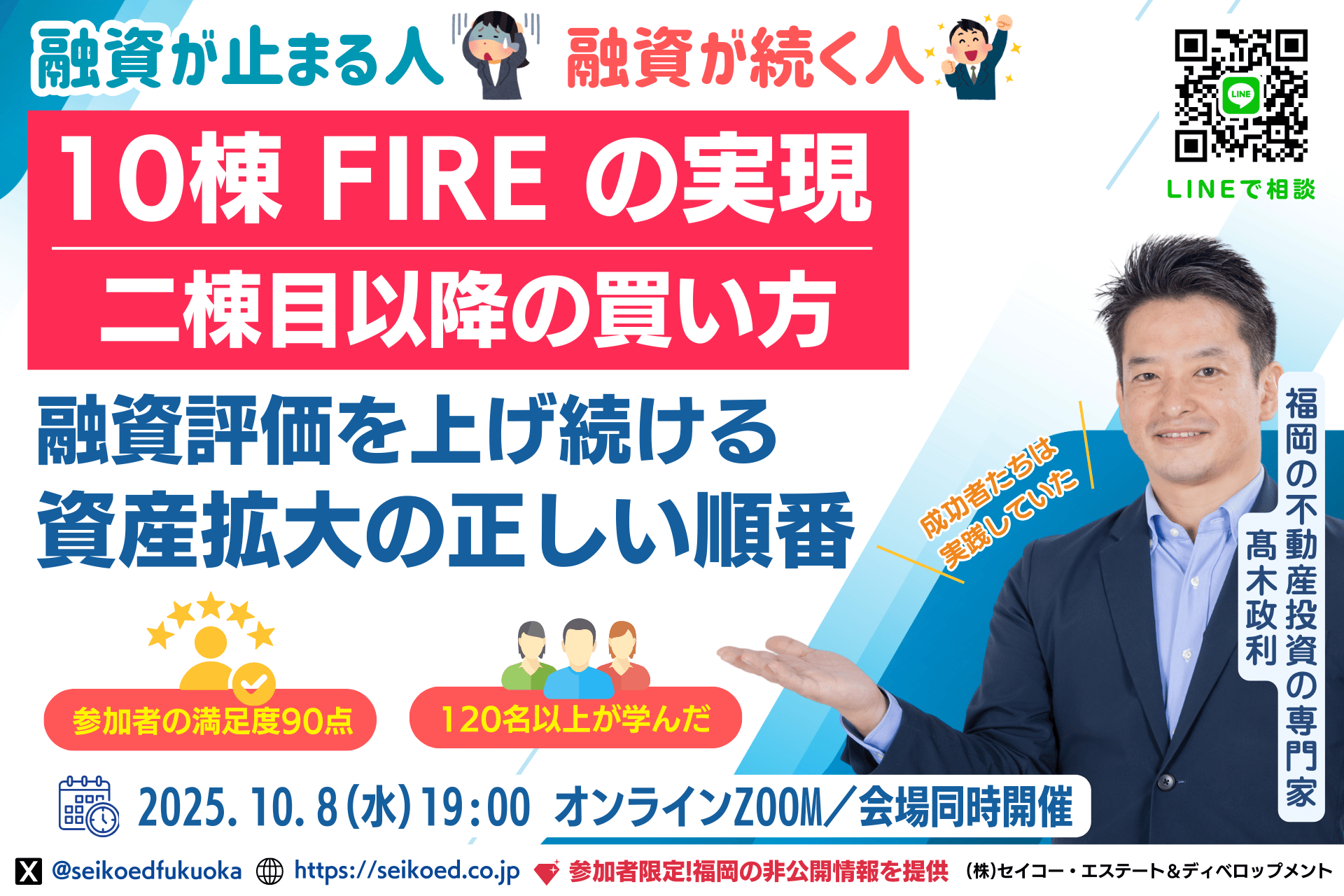 「1棟目は買えたのに、2棟目や3棟目で融資が止まってしまう」──これは多くの不動産投資初心者が直面する壁です。株式会社セイコー・エステート&ディベロップメント(本社:福岡市、代表取締役:高木政利)は、2025年10月8日(水)19時に不動産投資の無料セミナー『融資が続く人・止まる人。FIREを目指す2棟目以降の買い方』を開催します。これまで120名以上が参加し、参加者満足度90点を誇る人気セミナーで、会社員でも10棟・FIREを目指せる具体的な不動産投資戦略を学べます。