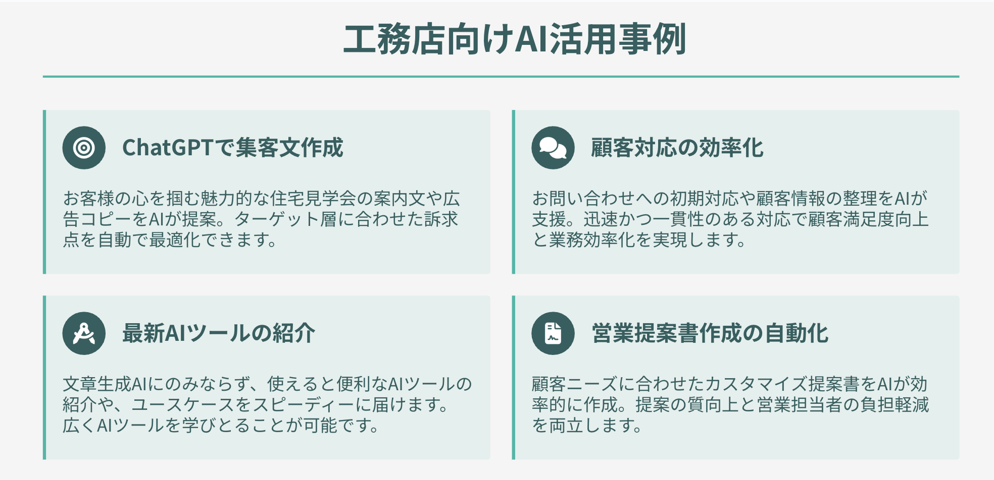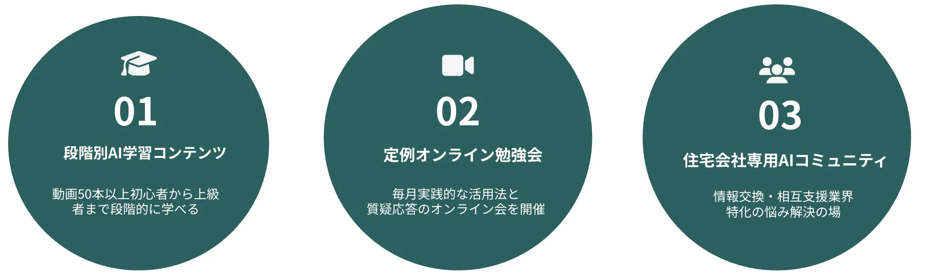 動画学習・定例勉強会・専用コミュニティを組み合わせることで工務店や住宅会社における業務効率化・顧客対応力の強化・AI人材育成を支援します。
