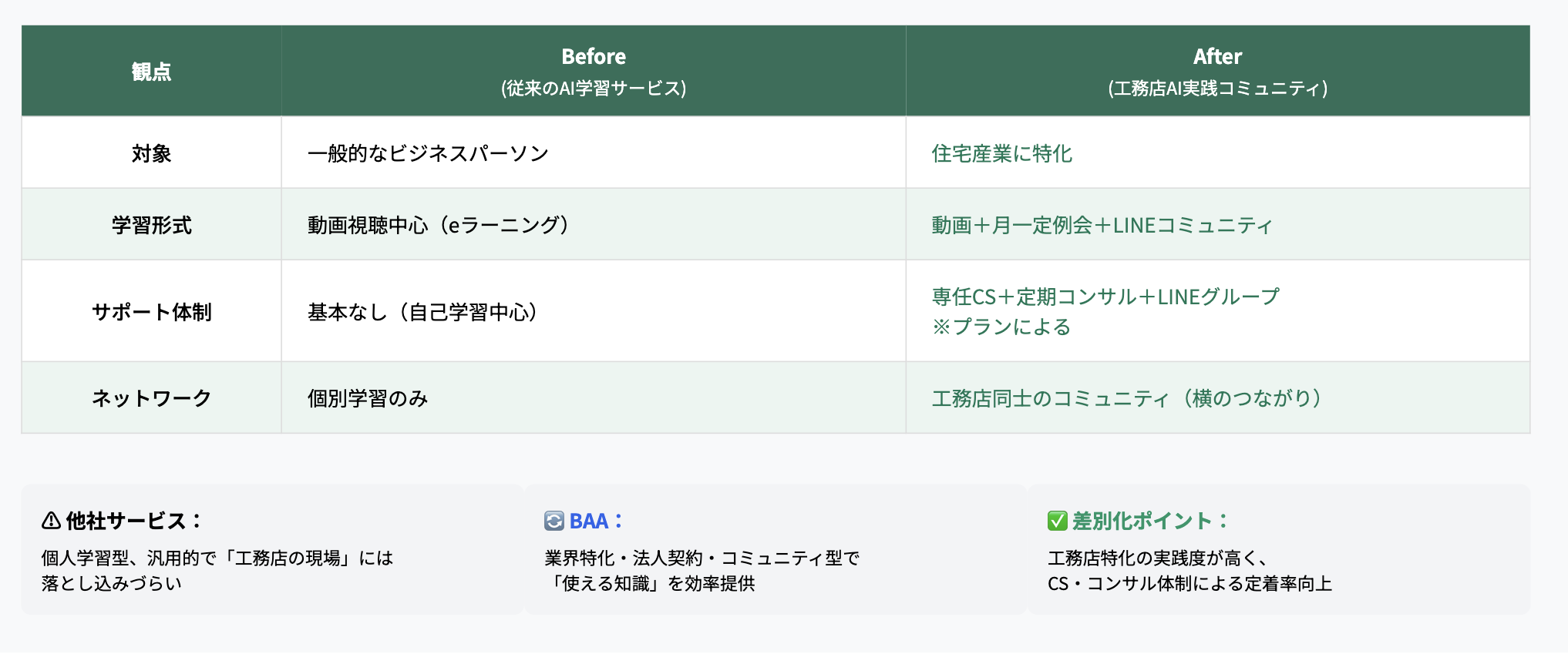 従来のAI学習サービスが“個人学習中心・汎用的”であるのに対し、BAAは住宅業界に特化した実務直結型の仕組みを提供します。専任CSや定期コンサルによる支援、そして工務店同士をつなぐコミュニティにより、“現場で活かせるAI活用”を実現します。