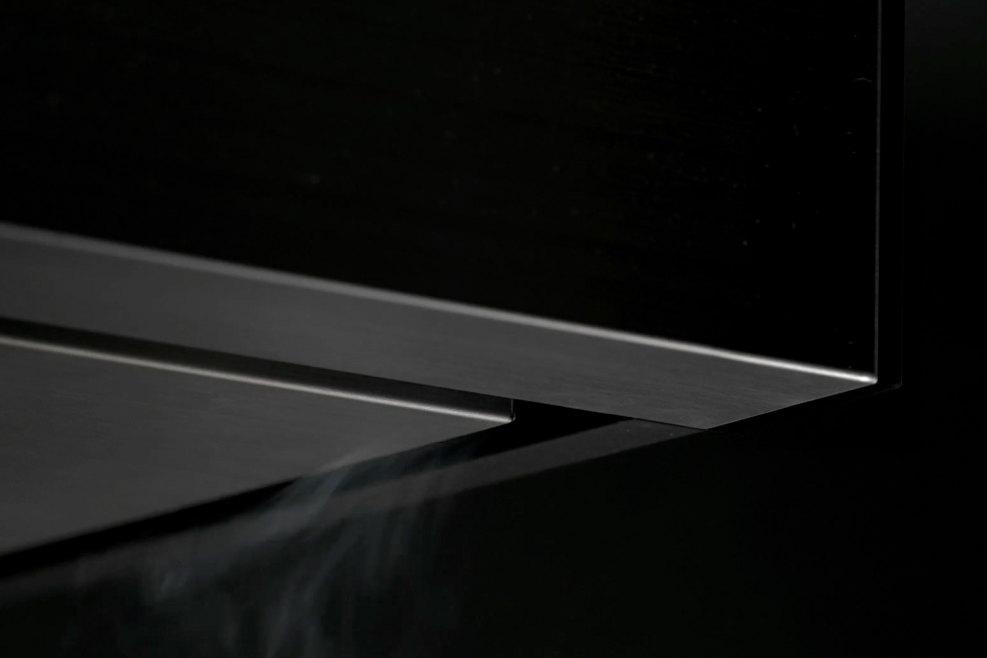 オープンなキッチン天板上は、気流の流れを遮るものがなく、空気の対流が起きやすいもの。天井高のある空間でも煙が拡散しないよう、煙の捕煙力にも気を配りました。