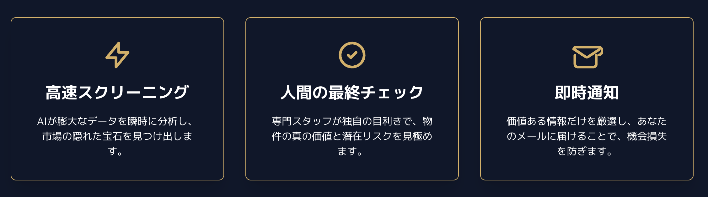 3. 即時通知 – 厳選された物件情報をメールで即時配信。投資機会を逃さずキャッチできます。