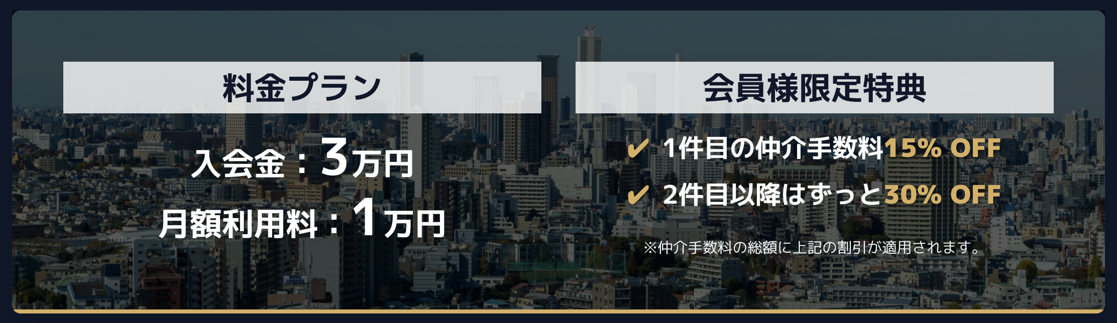 仲介手数料: 初回 15%OFF、2件目以降 30%OFF