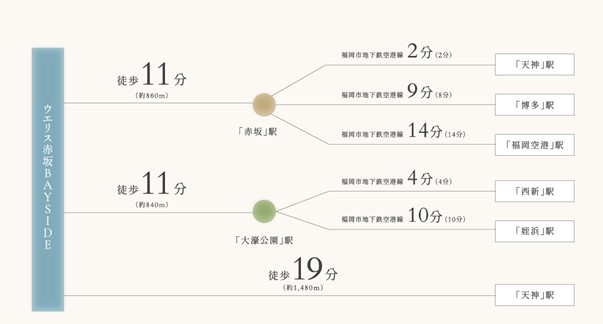 ・福岡市地下鉄空港線「赤坂」駅・「大濠公園」駅の2駅から徒歩11分という好立地であり、福岡の中心地「天神」駅へも徒歩19分でアクセス可能。通勤や通学、日々の移動がスムーズに行えます。