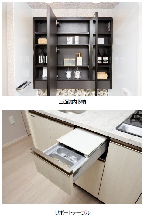 ・リネン庫や三面鏡内収納を設け、コンパクトながらも充実した収納量を確保