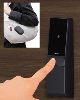 ・全住戸の玄関に標準設置されるスマートロックは、非接触キーをかざしたり、キーを携帯した状態でボタンを押すことにより、施錠や解錠が可能です。また、外出先からもスマートフォンで施錠状態の確認と施解錠ができます。