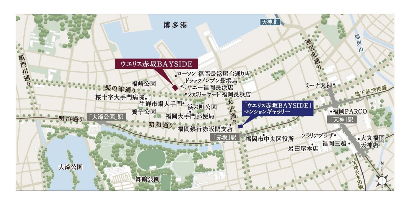 NTTグループのCRE(Corporate Real Estate)戦略の一環として株式会社NTTドコモから取得した土地に新築する本物件は、赤坂と大濠公園、2つの魅力的なエリアに自在にアクセスできる希少な立地にあり、都市の利便性と自然の潤いを兼ね備えた住環境を実現します。都心の主要エリアにつながる両駅と住まいの間には、フラットな徒歩ルートが整っており、毎朝の出勤や帰宅時の快適性を高めます。さらに、徒歩2分の場所には、年中無休24時間営業のスーパーマーケット「サニー福岡長浜店」や、ドラックストア・100円ショップ・フィットネス・クリーニング店等、計13店舗が入居する「キテラタウン福岡長浜」があり、生活利便性施設が揃っています。