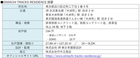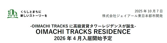 株式会社ジェイアール東日本都市開発(本社:東京都渋谷区、代表取締役社長:根本 英紀)は、2026年3月28日(土)にまちびらきを迎えるOIMACHI TRACKS内に開発中の高級賃貸タワーレジデンス「OIMACHI TRACKS RESIDENCE(以下、本物件)」の入居開始時期を2026年4月(予定)にすることをお知らせします。また、本日、本物件のオフィシャルサイト(https://www.oimachi-tracks-residence.jp/)を開設しました。