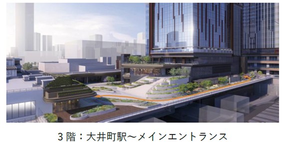 大井町駅から徒歩2分(約100m)という至近性に加え、駅の改札から2階デッキを経由することによりアンブレラフリーでアクセスできる動線を確保しており、お住まいになる方々に駅前の特等席に住む特別感を感じていただくことができます。また、OIMACHI TRACKSには、緑豊かな広場などのパブリックスペースが整備されるほか、レジデンスの足元にはアウトモール型商業施設も開業予定です。都心にいながら、自然の憩いを感じられるとともに、シネマコンプレックスやスパ・サウナといった施設をレジデンスの共用施設のような感覚でお使いいただくことができます。