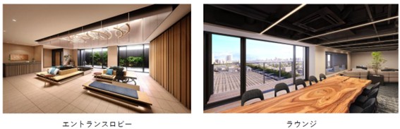 JR大井町駅とペデストリアンデッキで接続する3階にメインエントランスを配置しています。ロビー空間は木を基調とした木漏れ日を感じさせるインテリアとなっており、住民の皆さまを優しくお出迎えします。ロビーの北側には、お住いの方だけが利用することができるプライベートテラスを設け、都心にいながら自然を感じられるリラックス空間を提供します。また、来客対応可能なミーティングルームを併設しています。