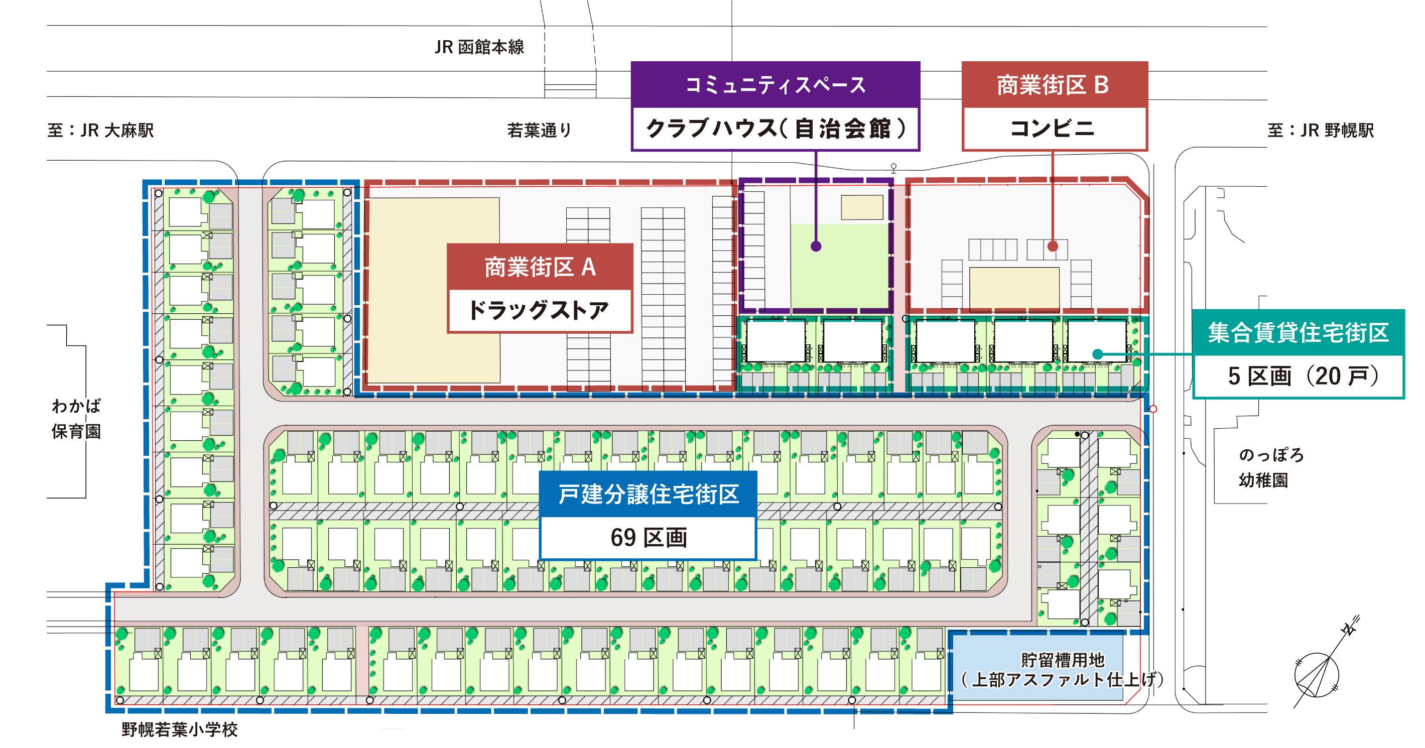 当社では、JR函館本線「野幌」駅から徒歩8分の立地に位置する当該土地において、戸建用宅地(69区画)・集合賃貸住宅(全20戸)の住居、商業施設・クラブハウス(自治会館)の利便施設を計画。IoT技術などを活用し、子育て世代から高齢者まで安心・安全に暮らせ、生活利便性と地域活性化が共存する複合的なまちづくりを行います。