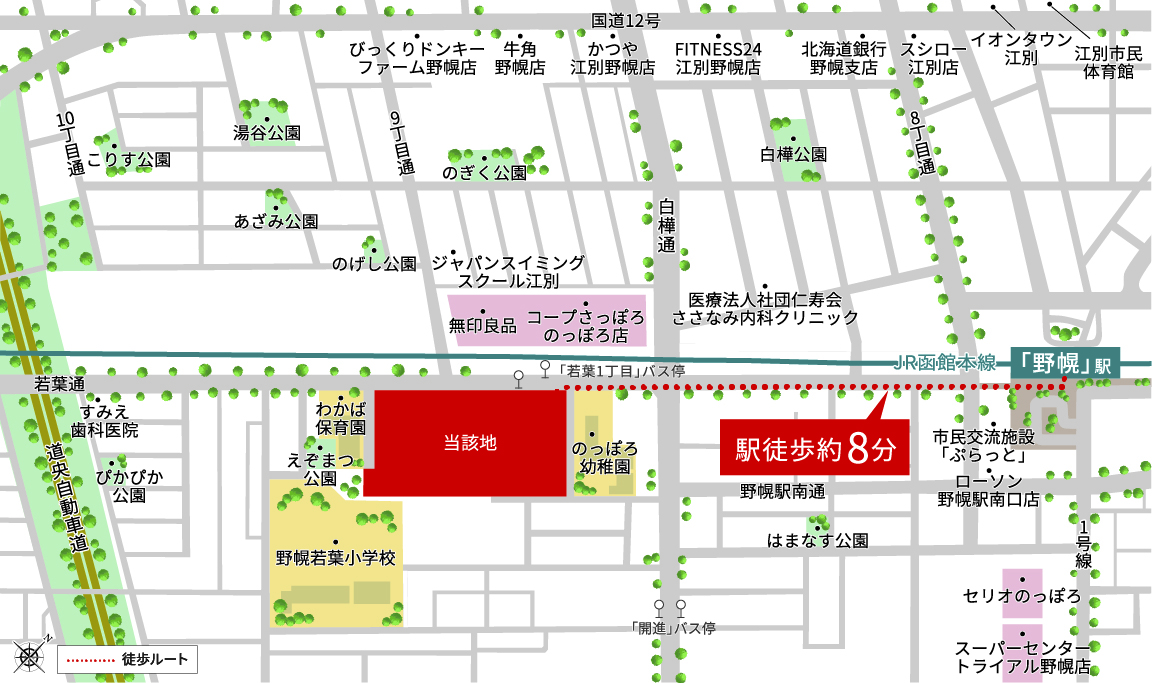 ・交 通:JR函館本線「野幌」駅徒歩約8分(約580m)