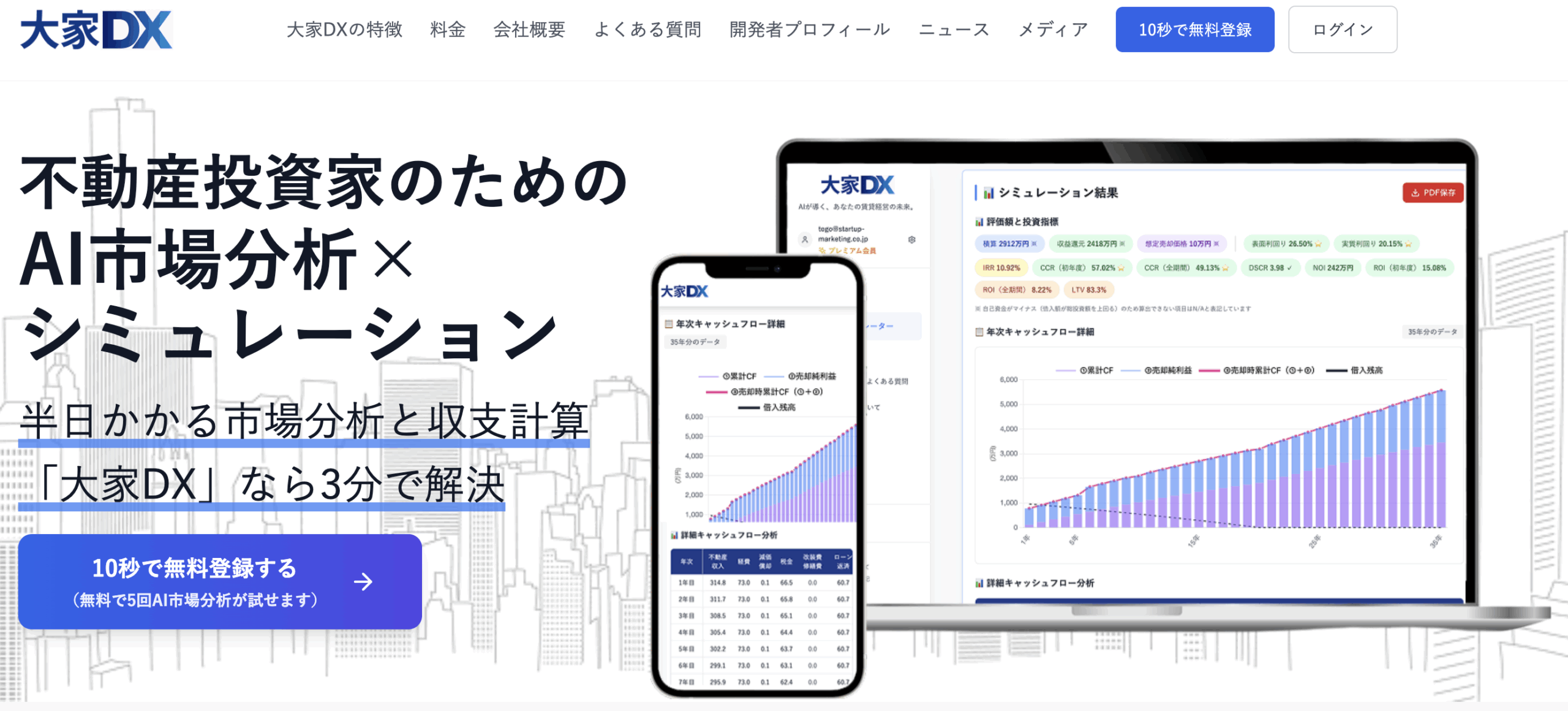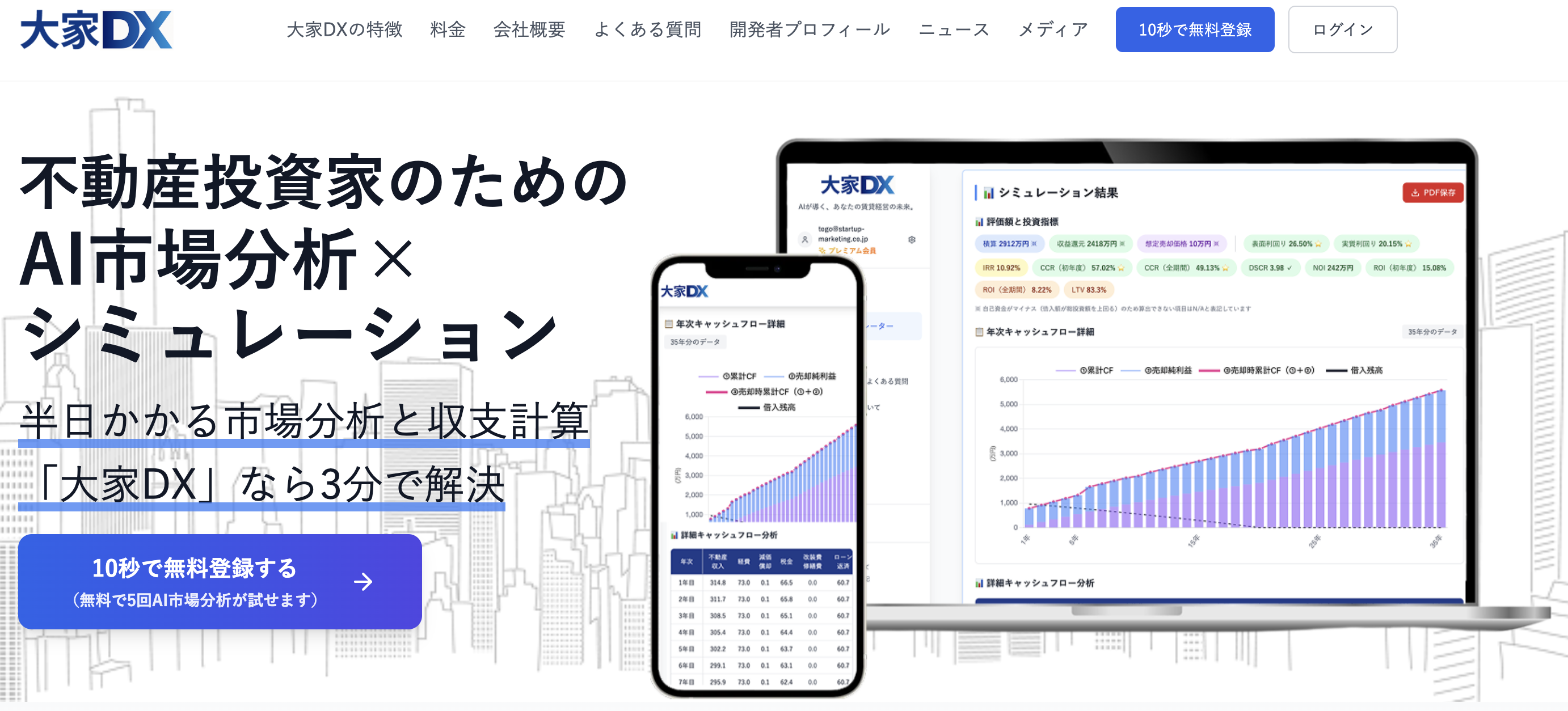 株式会社StartupMarketing(本社:埼玉県さいたま市)は、不動産投資家向けAI市場分析・収益シミュレーションSaaS『大家DX(おおやディーエックス)』を2025年10月14日(火)に正式リリースしました。物件住所を入力するだけで、AIが類似物件の取引事例を自動収集・分析し、35年のキャッシュフローを瞬時に可視化します。無料プランでは月5回まで全機能を試すことができ、有料プラン(月額4,980円)ではAI市場分析: 月100回・収益シミュレーション: 回数無制限・公示地価検索: 月100回でご利用いただけます。