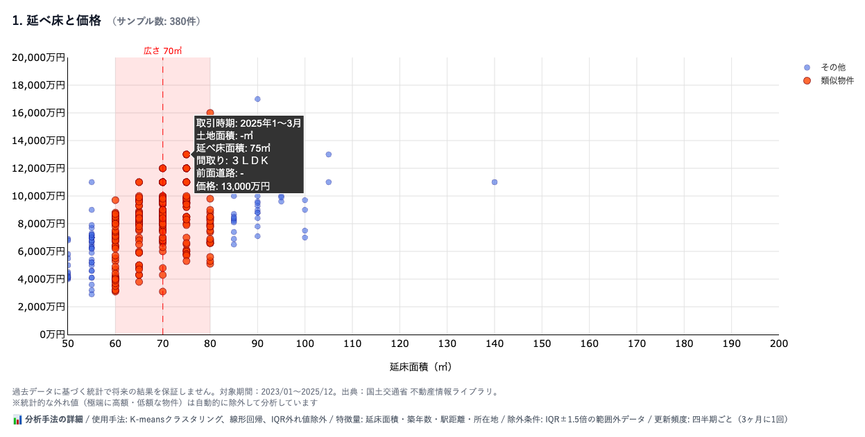 物件住所を入力するだけで、AIが類似物件の取引事例を自動収集・分析。取引価格、延べ床面積、建築年、間取りなど詳細データを一覧化。地域の価格分布・中央値レンジを可視化し、投資判断の材料を3分で取得。