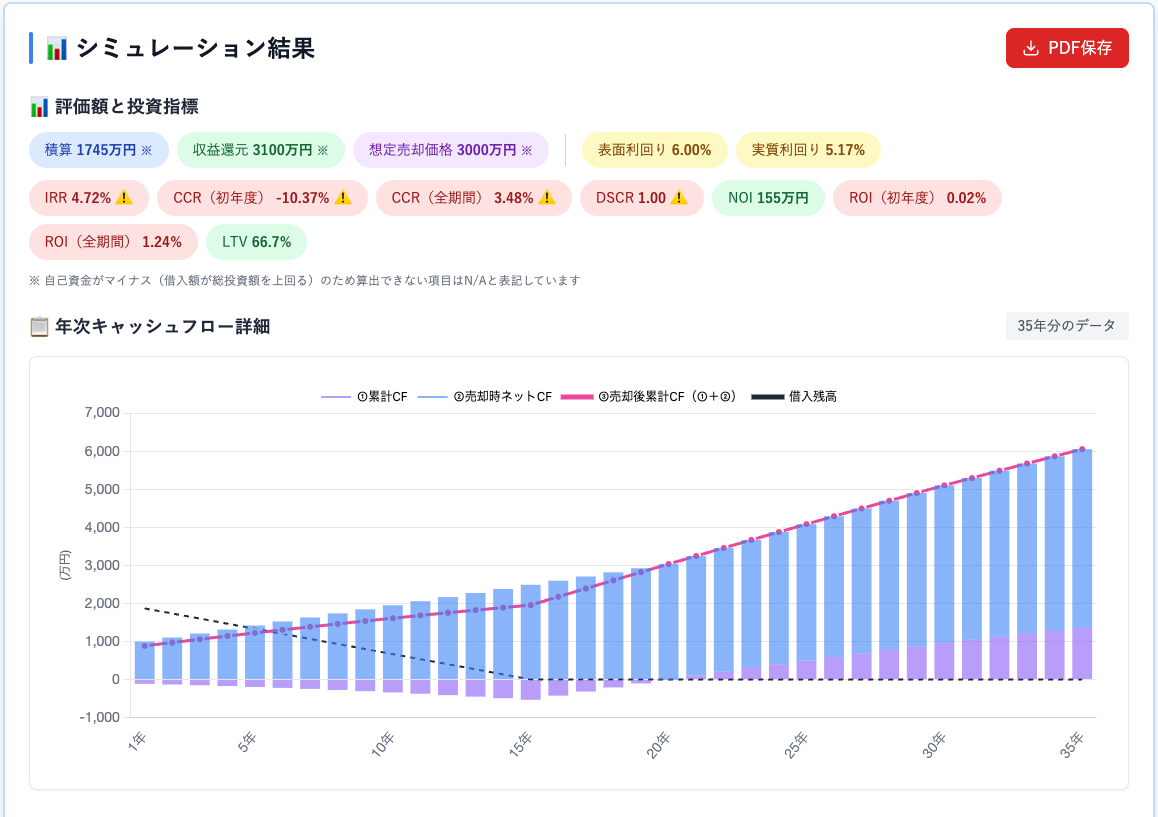 35年のキャッシュフローをグラフと表で可視化。収入・経費・税金・返済・残債・自己資金回収率を年ごとに表示。各年度の重要指標を年次で可視化。投資判断を強力にサポート。IRR・CCR・DSCR・FCR・LTV・NOI等の主要指標を自動計算。A4サイズのPDFにも保存して印刷可能。