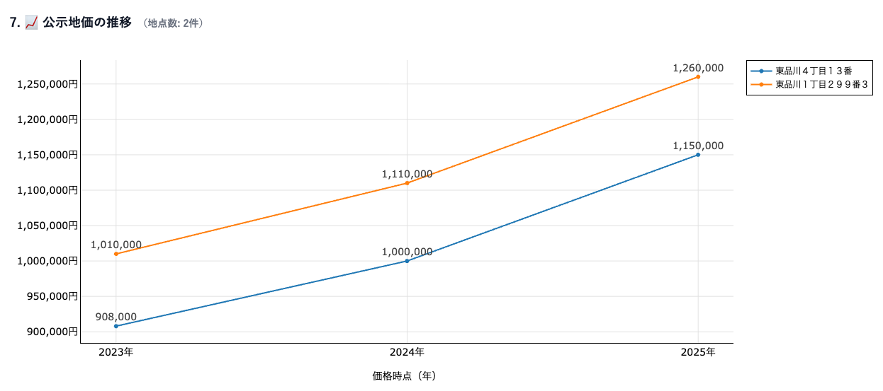 物件周辺の公示地価を検索・可視化。直近4年分のトレンドをグラフで確認。