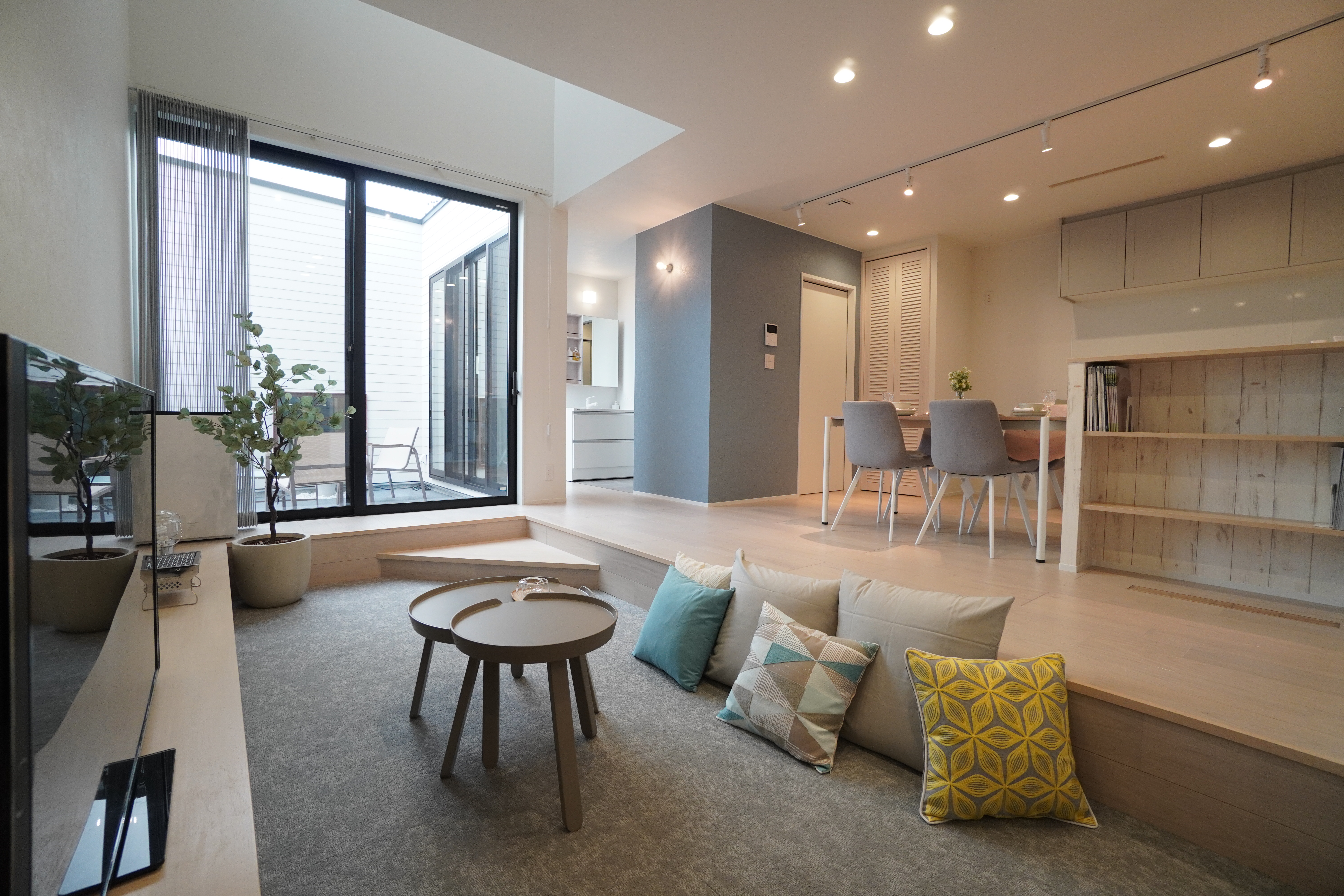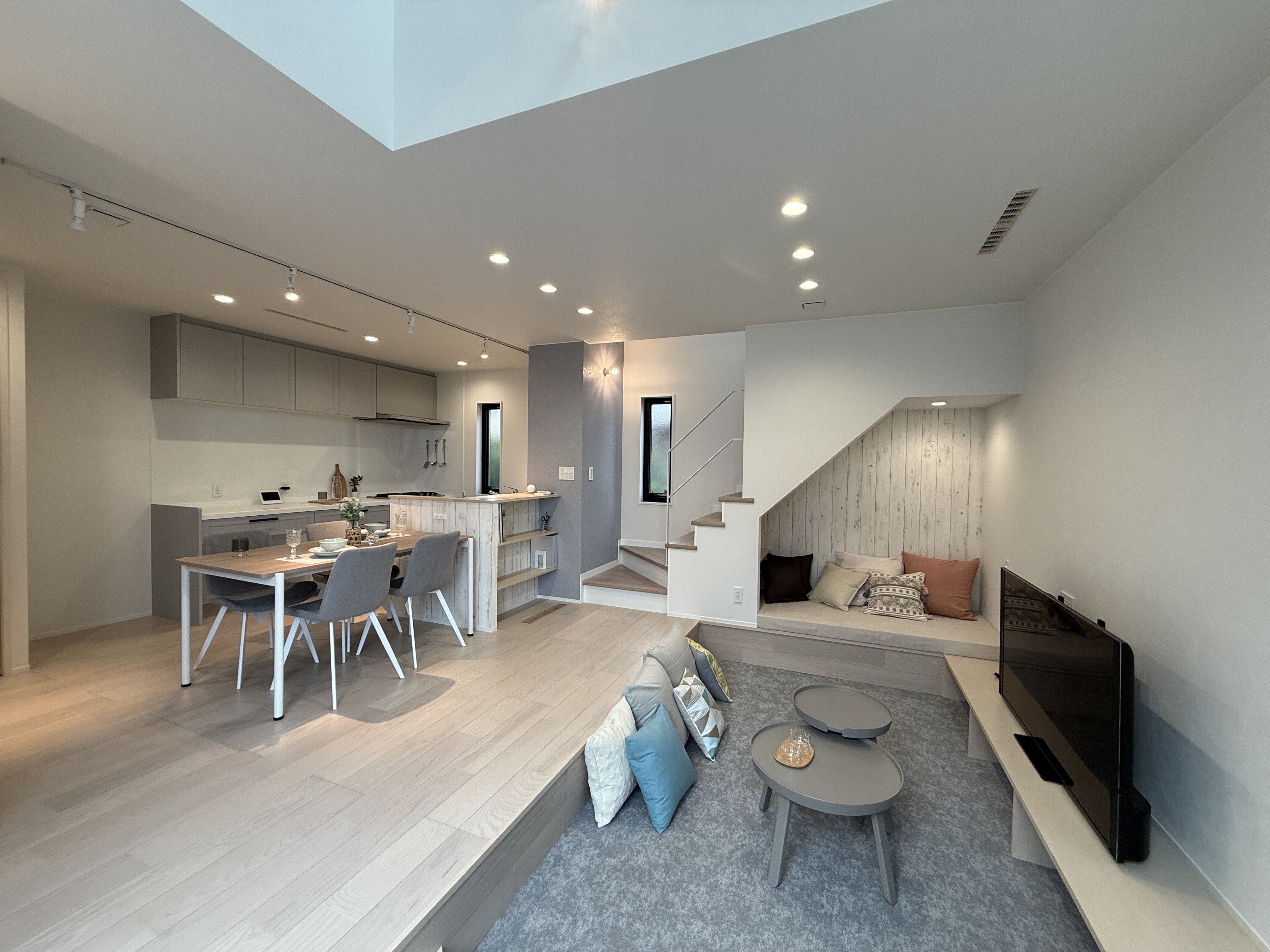 子育て世代を想定し、1階で生活が完結する間取りや、Ⅱ型キッチン※2・乾太くん・全館空調などの最新設備を備え、家事負担を軽減しながら快適な暮らしを提案します。