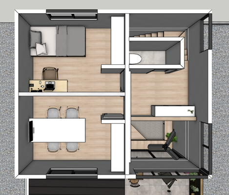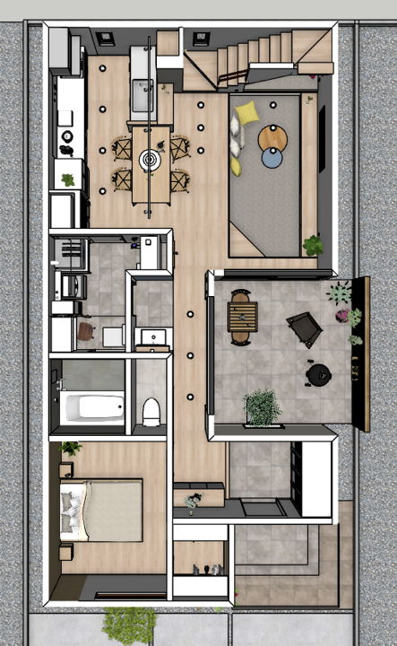 南側に道路が面する立地を活かし、あえて北側にリビングを配置。中庭を設けることで光と風を取り込み、外からの視線を遮りながら明るく落ち着いた空間を実現しました。