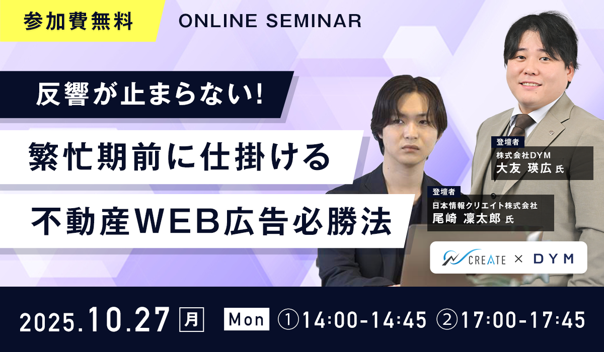 不動産テックを推進する日本情報クリエイト株式会社(本社:宮崎県都城市、代表取締役社長:辻村 都雄、証券コード:4054)は、2025年10月27日(月)に無料オンラインセミナー(以下ウェビナー) 『反響が止まらない!繁忙期前に仕掛ける不動産WEB広告必勝法』を開催いたします。