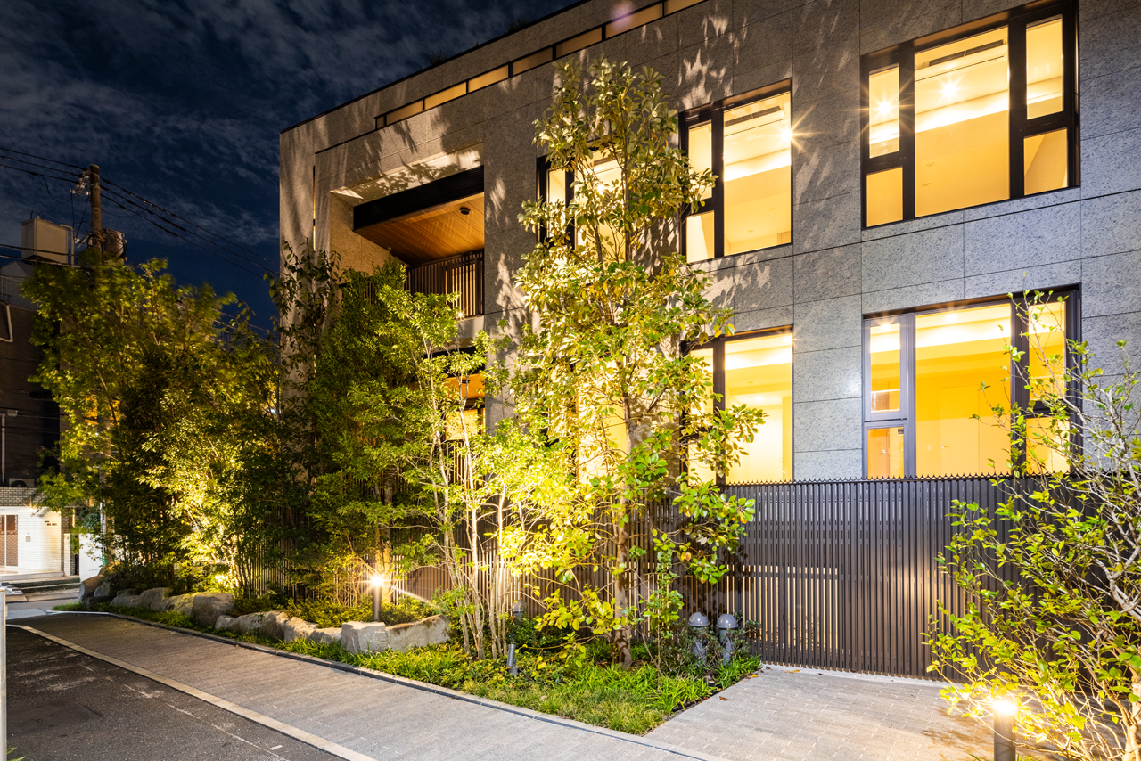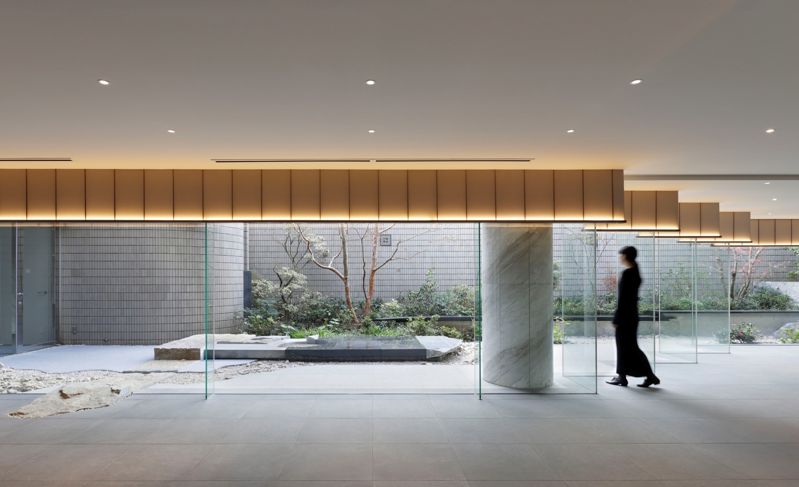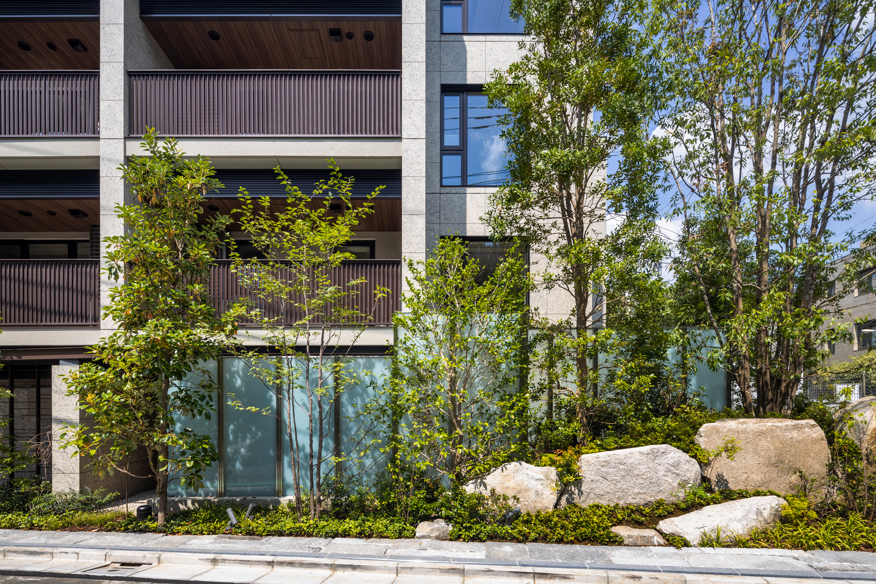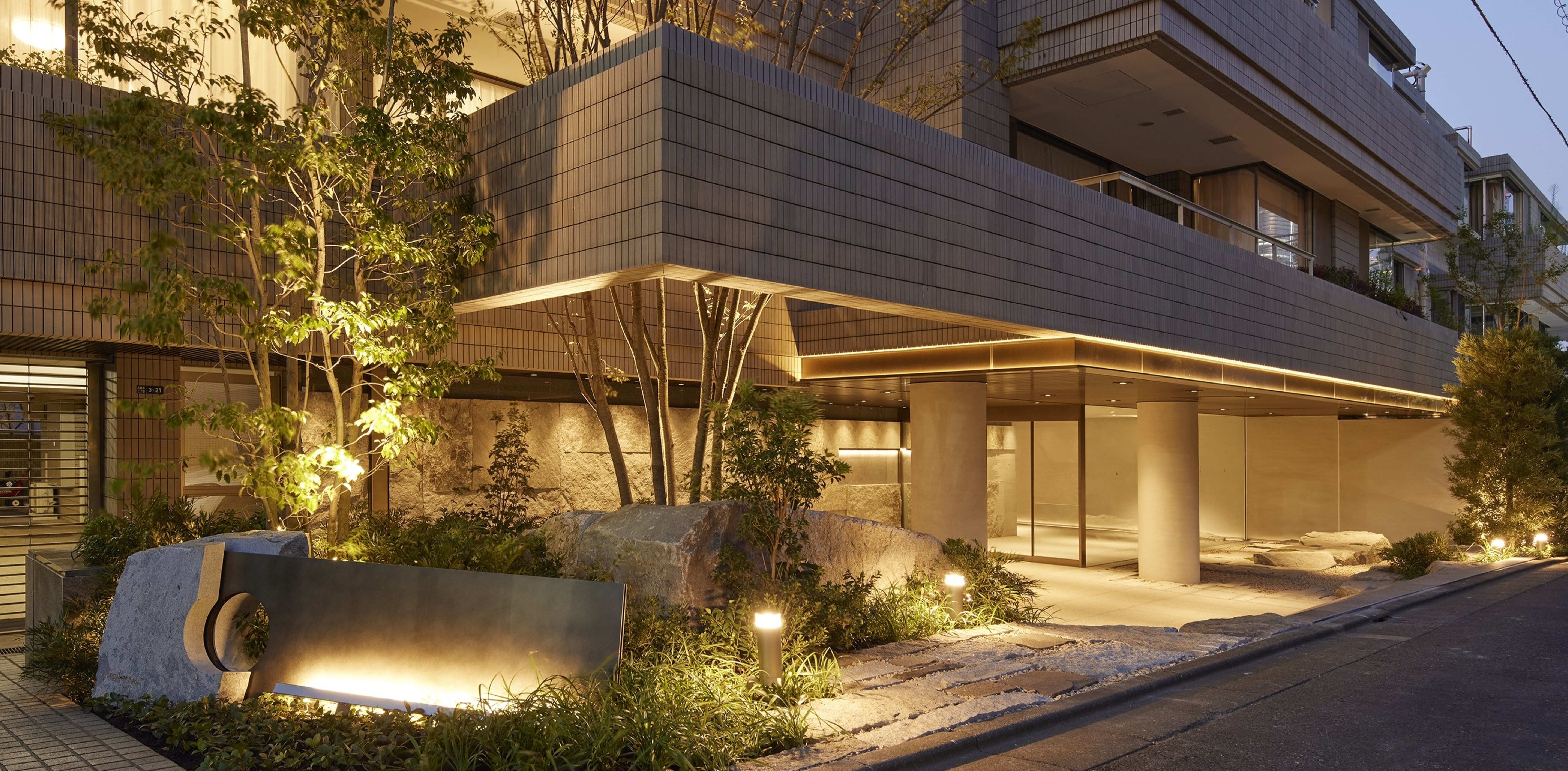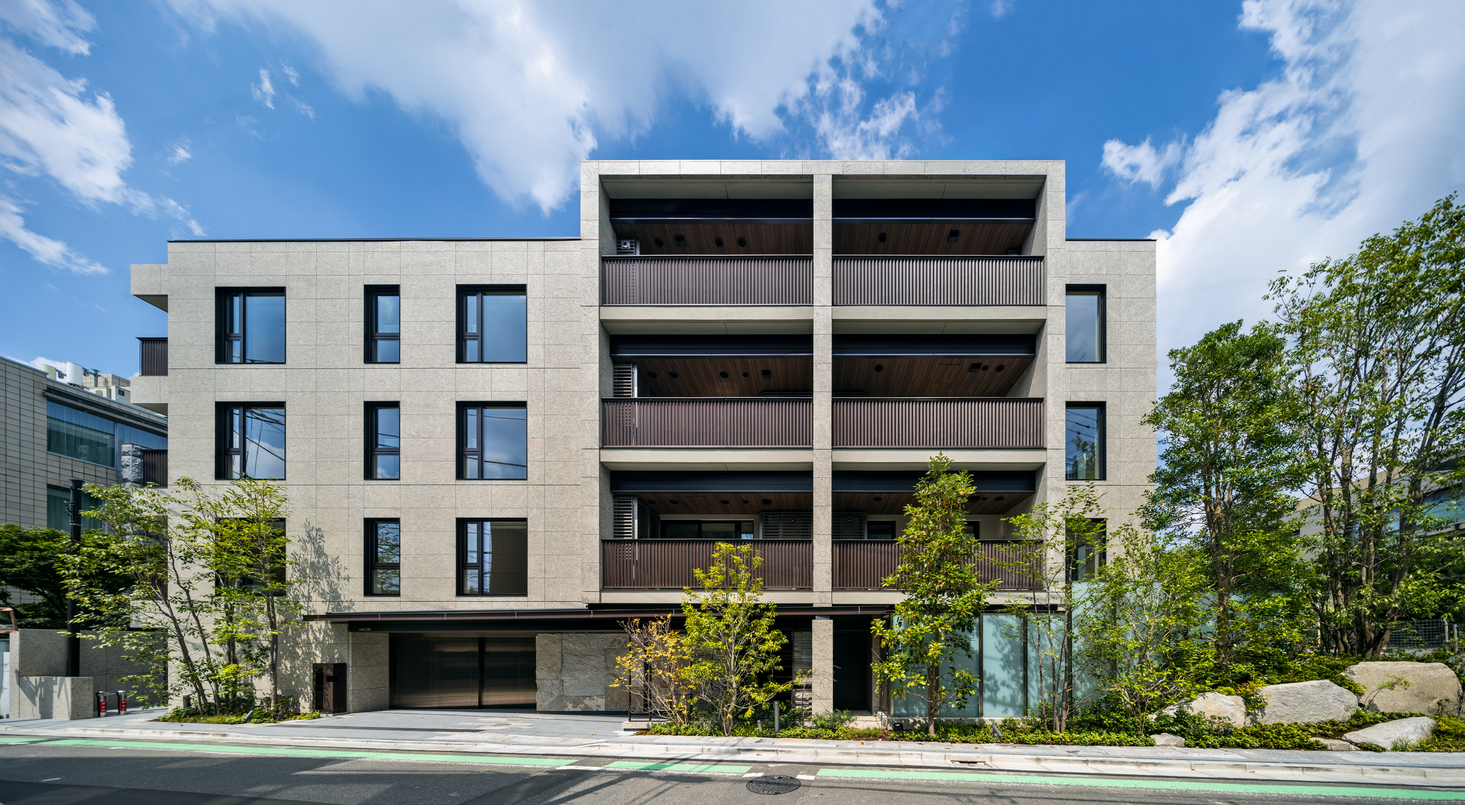 代官山の歴史的な路地文化を再解釈し、地域との調和を図った集合住宅である。計画地は「七曲り」と呼ばれる路地の起点に位置し、かつての風情ある街並みを再構築することをめざした。ランドスケープは、シラカシのシンボルツリーや連続する植栽によって、柔らかな緩衝帯を形成し、住民と街との自然なつながりを創出している。建築は「まちとの接点としての建物」を志向し、窓先空地を活かした凹凸のある形状で圧迫感を軽減している。能の「間」の美学を取り入れた開口部構成により、光と風を巧みに取り込む設計となっている。バルコニーには角度を持たせたルーバーを採用し、視線の遮蔽と通風・採光の両立を実現している。住戸の軸線上に中高木を配することで、隣地との緩衝帯を形成し、室内には木漏れ日が差し込む心地よい空間が広がる計画である。