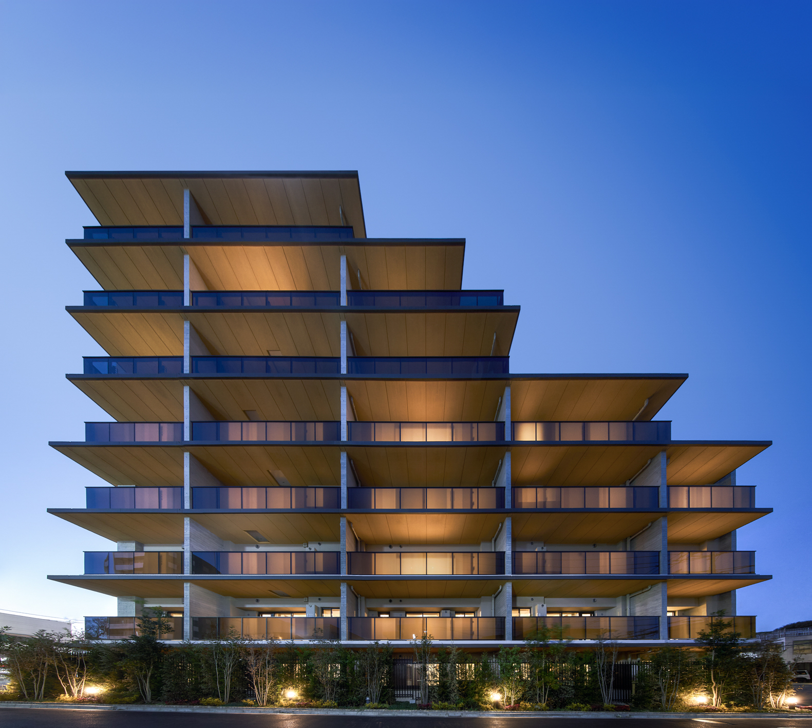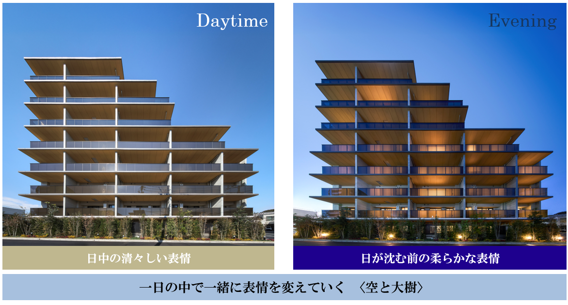 都市と自然の共存を意識した設計が印象的な集合住宅である。幹線道路沿いという立地条件に配慮し、遮音性を確保しながらも、周辺住民が大切にする「空とのつながり」を損なわないよう工夫されている。建物全体を「空に向かって伸びる樹木」と見立て、中低層の構成によって背景の空を広く見せる設計が採用されている。バルコニー庇の深い目地で力強い幹を、杉板型枠仕上げの戸境壁で繊細な枝を表現するなど、シンプルにデザインをまとめつつ街に対する気遣いが感じられるデザインである。このプロジェクトは、地域の環境や住民の価値観に寄り添いながら、街並みに調和するランドマークとしての役割を果たしている。空とともに表情を変えるその姿は、日常に自然な形で溶け込み、周辺に穏やかな存在感をもたらしている。過度な主張を避けつつも、地域に新たな魅力を加える建築として、静かに評価されるべき取り組みと言える。
