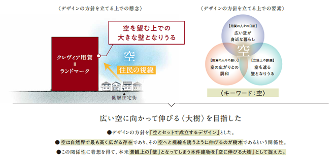「本建物=広い空に向かって伸びる大樹」として定義し、建物デザインに落とし込むことで、「日常における空の広がりとの調和」という用賀の人々の根源的な願いに応えるランドマークを目指した。