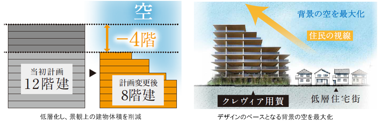 1.背景の空を広く見せるため、建物をあえて中低層化。