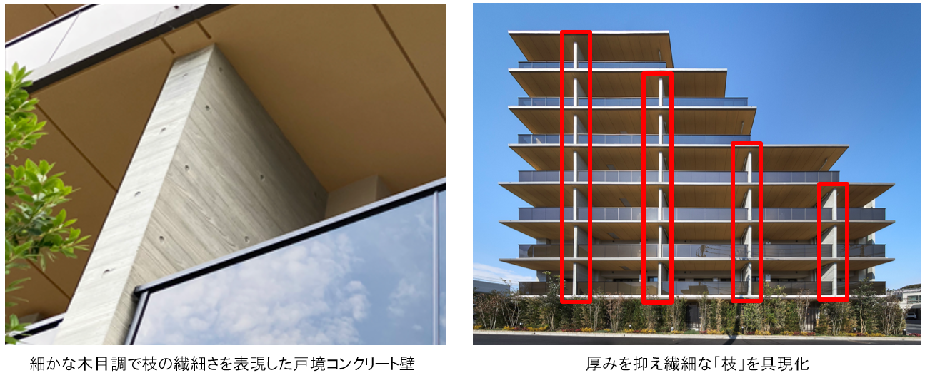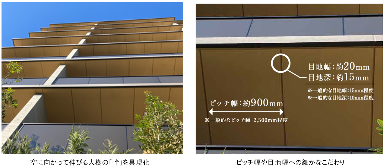 2.大樹のダイナミックな幹を表現するため、バルコニー庇の目地を深く広く設け、迫力のある木板調の風合いを実現。