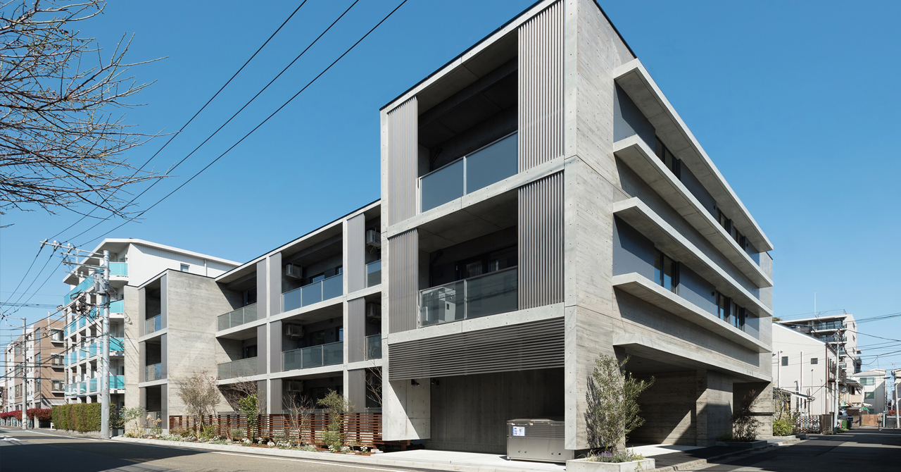 過剰な装飾を排し、シンプルで洗練された日本古来の美を体現したRC造賃貸集合住宅。無機質なコンクリートは杉板型枠により豊かな表情を与えられ、経年変化でさらに味わいを増す。共用ホールや中庭は人と人との交流を促し、建物を介して人々が繋がる場を創出している。住人を優しく包みながら、年月と共に地域の風景と重なり成長していく建築である。