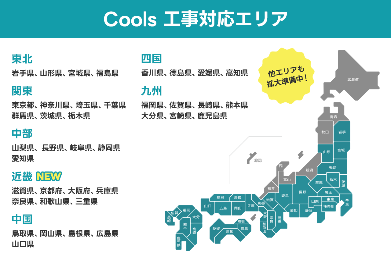 弊社では2024年以降、事業の急拡大・急成長を続け、国内でのシェアを着実に増やしてまいりました。今回のエリア拡大により、これまで対応していなかった滋賀、京都、大阪、兵庫、奈良、和歌山にお住まいのご家庭でも、Coolsの安心・丁寧な施工サービスをご利用いただけるようになります。