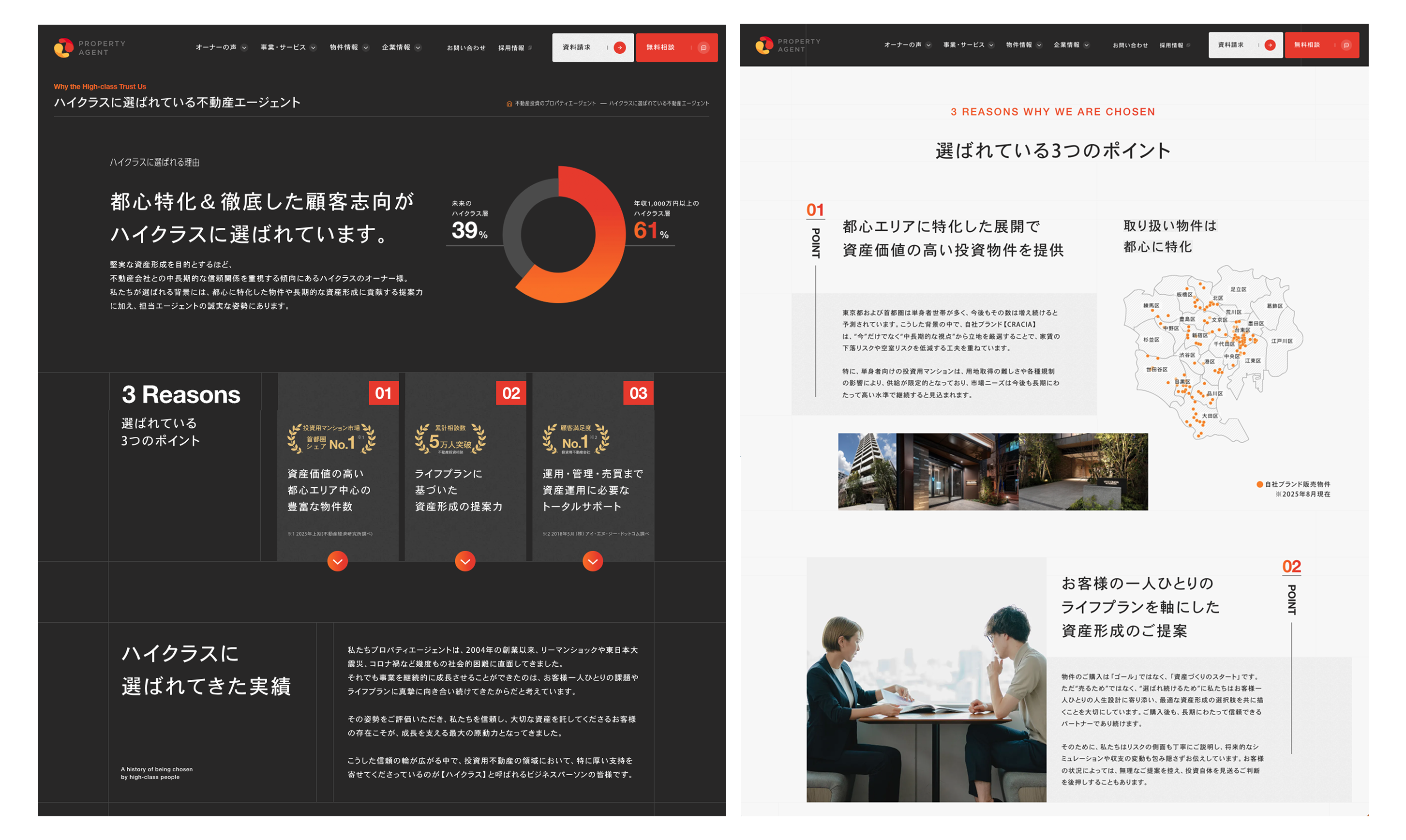 当社は、多くのハイクラスの皆さまに支えられ、創業以来21期連続で増収を達成いたしました。日々忙しくビジネスに励み、「長期的な信頼関係を重視し、安心して任せられるパートナーを選ぶ」という価値観を持つハイクラス層に、なぜ選ばれ続けてきたのか?その理由を紐解くコーポレートサイトとなっております。