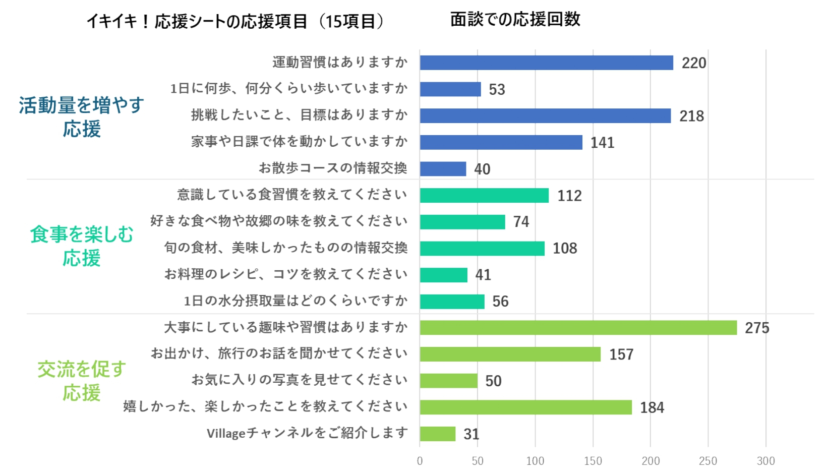 相談員は、ケア視点だけでなく健康長寿視点を加えた面談で、入居者のできることに目を向けた健康行動を維持・増加する応援を実施。相談員と入居者のコミュニケーションツールである「イキイキ!応援シート」を用い、活動量では運動習慣を教えてもらう、食事では得意料理・好きな食べ物・旬の食べ物の話題をする、交流では趣味やお出かけ先・写真を見せてもらうなどの話題で、へーベルVillageの住環境を活用して散歩を誘発したり、入居者同士の交流促進のしかけであるデジタルサイネージへの投稿につなげるなど、行動を促すはたらきかけを継続します。