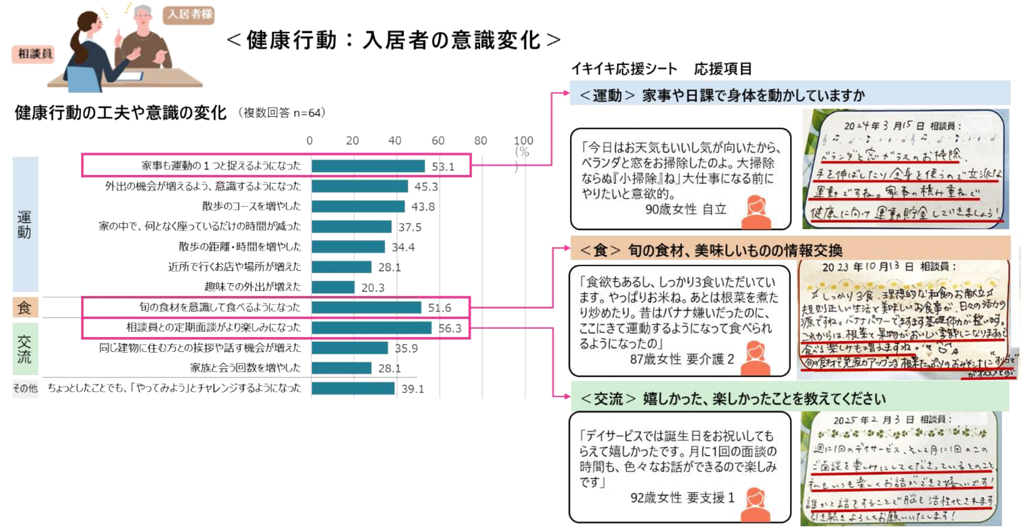 ② 家事も運動の一つととらえる、旬の食材を意識して食べる、相談員との定期面談が楽しみになった、など相談員の応援や勧めによって、入居者に工夫や意識の変化がみられ、健康行動の質が変わったことが分かりました。