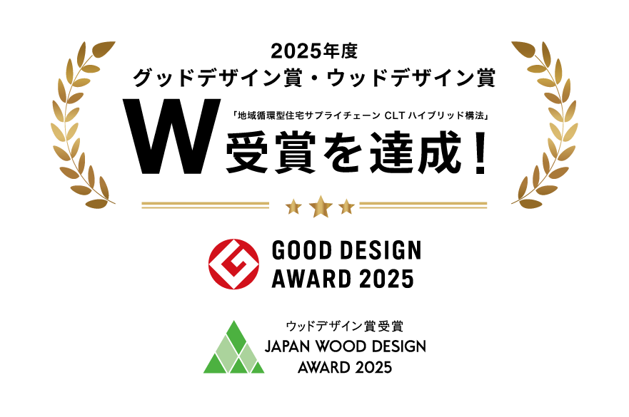 「地域循環型住宅サプライチェーン CLTハイブリッド構法」プロジェクトにおいて、「2025年度グッドデザイン賞」(運営:公益財団法人日本デザイン振興会)と「ウッドデザイン賞2025」(主催:一般社団法人日本ウッドデザイン協会)を受賞いたしました。