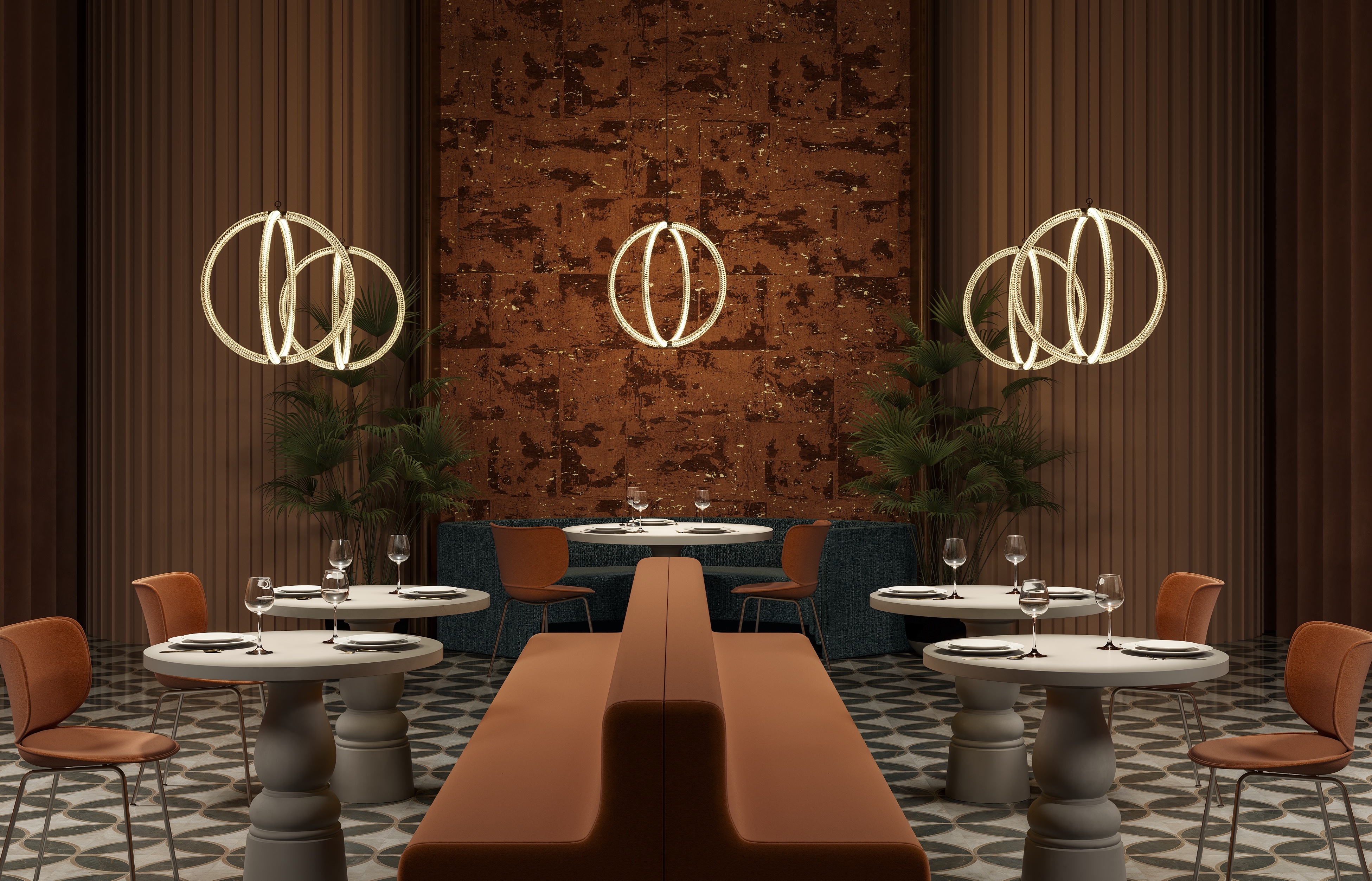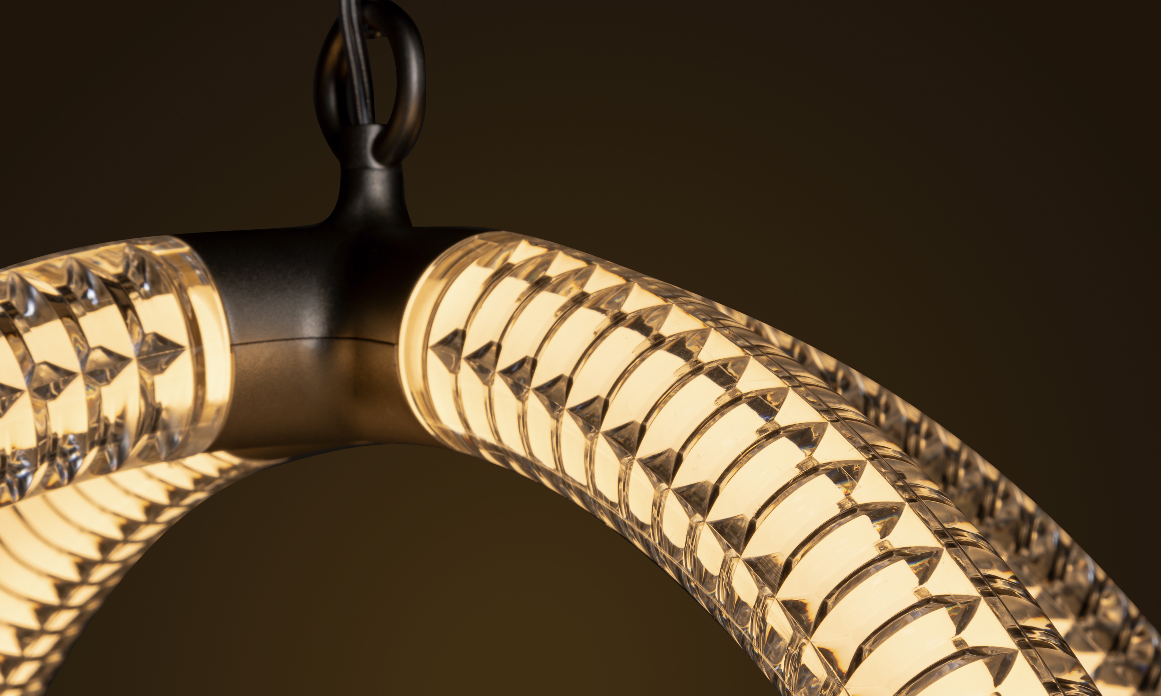 ムラーノガラスのような繊細な質感と透明感を、最新のポリカーボネート成形技術によって実現。ガラスのような美しさはそのままに、驚くほどの軽量化を達成しました。これにより、住宅からホテルまで、あらゆる空間に優美さと機能性を兼ね備えた光の体験をもたらします。真円を組み合わせた造形は、シンプルさと複雑さを併せ持つデザイン。角度によって異なる表情を見せ、空間に洗練された調和を与えます。