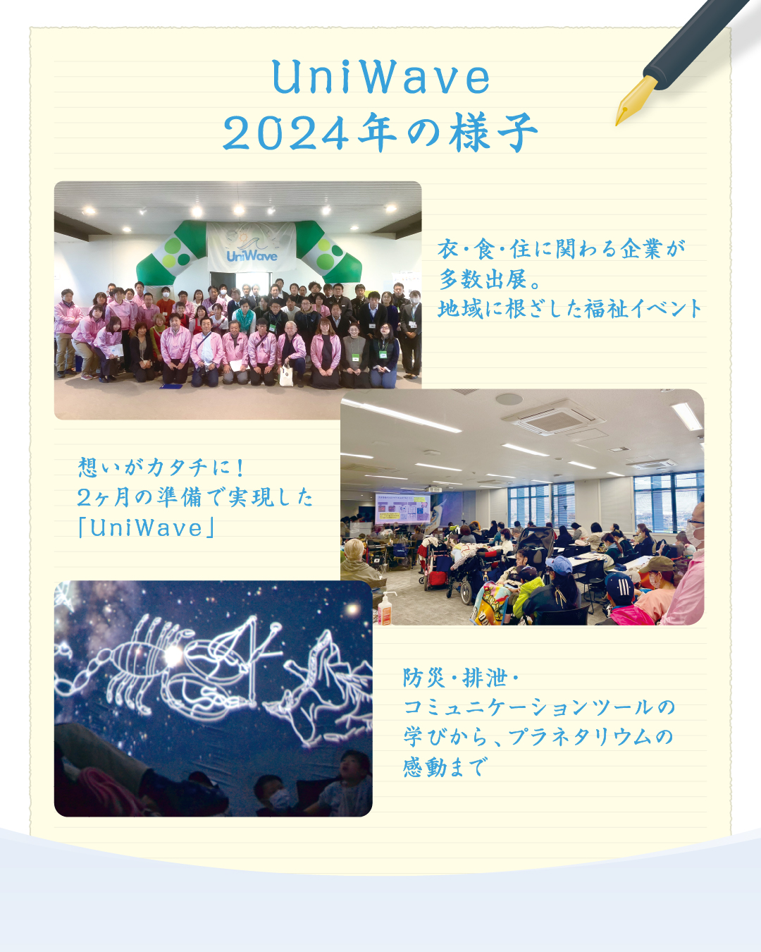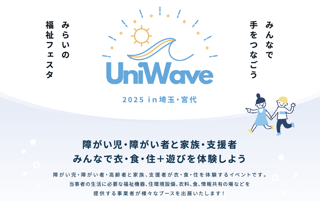 イベント名「UniWave(ユニウェーブ)」は、「Universal Wave(普遍の波)」を意味し、共生社会実現に向けた地域からのうねりとして、埼玉から全国へと広がる福祉の新たな潮流を創出することを目指しています。