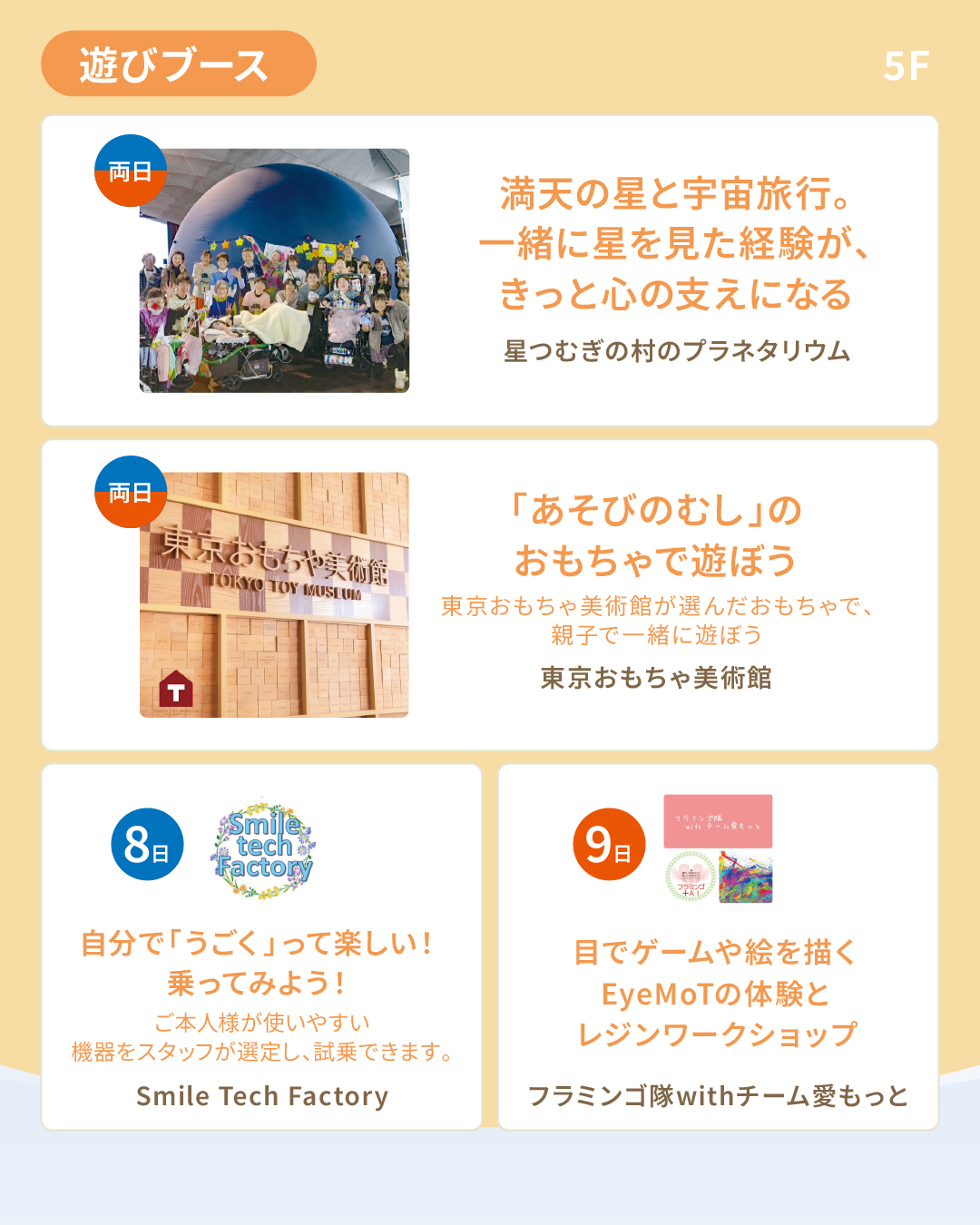 昨年も大人気だった「星つむぎの村」によるプラネタリウム上映を実施。満天の星空の下で、障がいの有無に関わらず全ての参加者が同じ感動を共有できる特別な時間を提供します。また、「東京おもちゃ美術館」の協力による、障がいの有無を問わず楽しめるユニバーサルトイの展示・体験コーナーを設置。「チャレンジママブース」では、障がい児を育てる母親たちが自ら企画・運営する体験プログラムを実施し、当事者目線での気づきと学びを提供します。