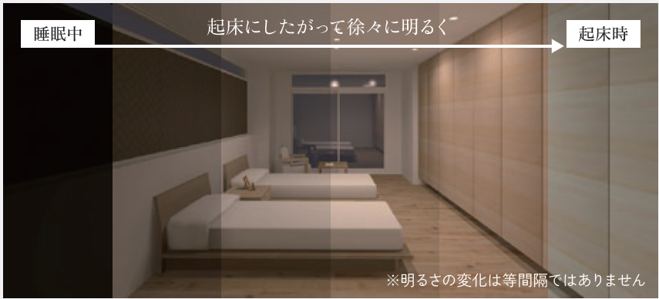 さらに、照明を起床時間に合わせて段階的に明るくなるように照度と色味を制御することで、気持ちよく一日のはじまりを迎えることができる目覚めをサポート。空調と照明の両面から快適な睡眠環境をつくります。