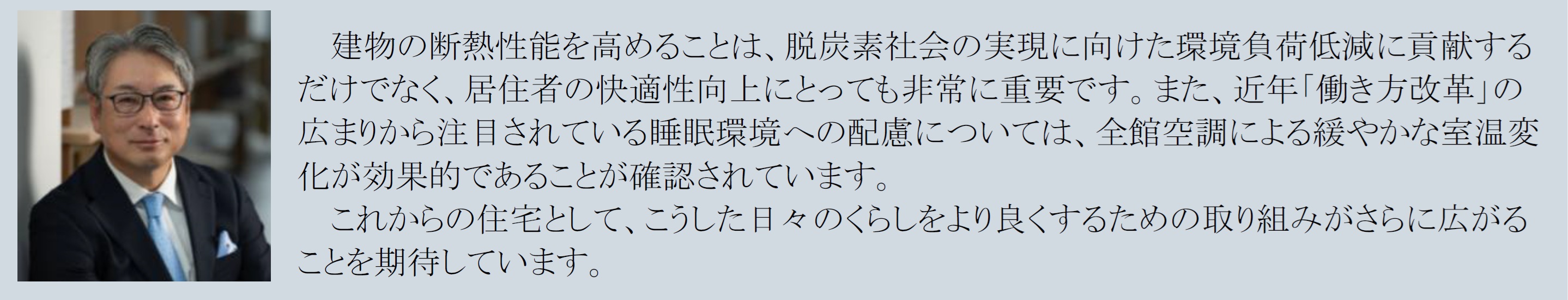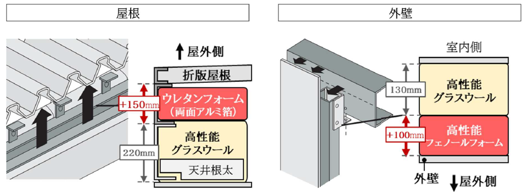 当社では省エネ性や快適性を高めるため、2024年1月より断熱等級6仕様を標準化(※7)し、その普及に努めてまいりました。今回、屋根と外壁について、従来の充填断熱に加え、新たに外側に付加断熱を組み合わせることで、断熱性能を飛躍的に向上させました。開口部の断熱強化と合わせ、断熱性能の最高等級である等級7(※1)にも対応可能となりました。