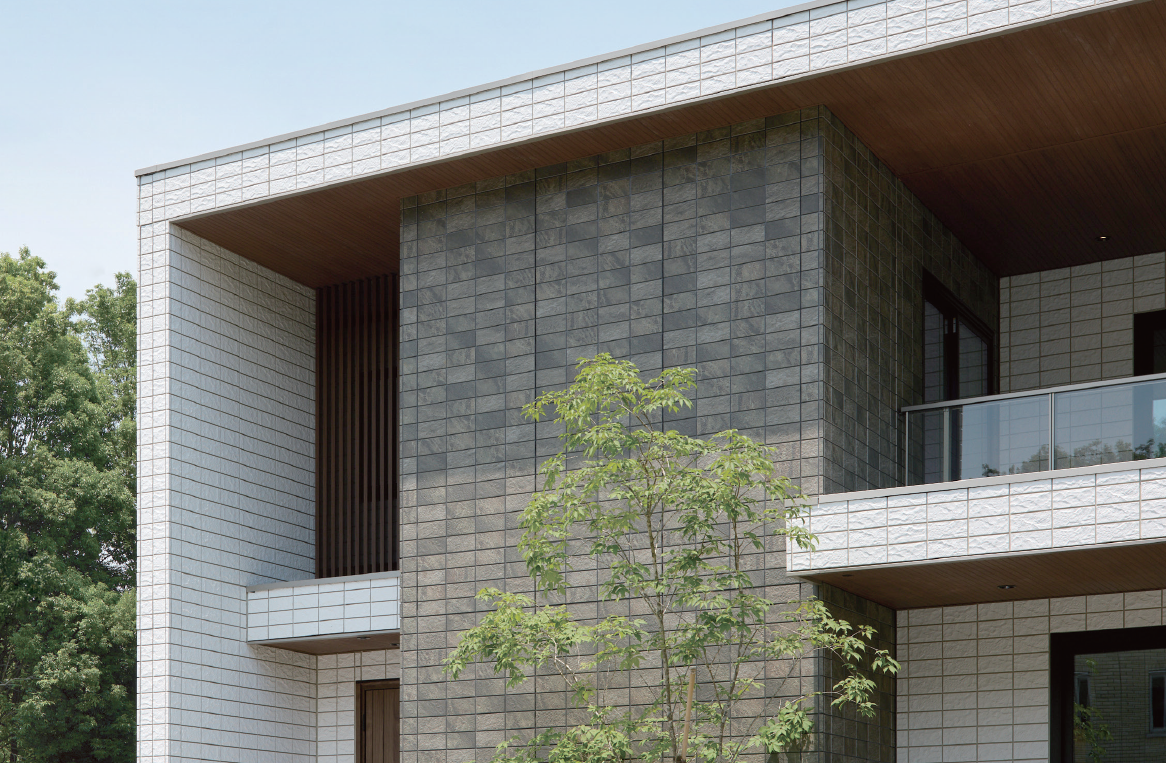 耐久性に優れた磁器タイル外壁は、色褪せることなく、長く建物の美観を保ちます。今回新たに導入した「ルミナタイル」は、形状や生地配合の検証を重ねることで、現行比約1.7倍の大判サイズを実現。さらに、施釉加工による色の深みと素材感の追求により、高級感あふれるテクスチャのデザインが外観にアクセントを加えます。