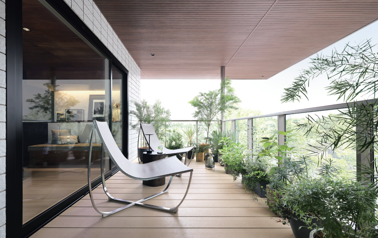 また、1階と2階に大胆に張り出した屋根庇は、モダンな造形の意匠性だけでなく、内と外を緩やかにつなぎ、自然と調和する生活上のゆとりの空間を創出します。