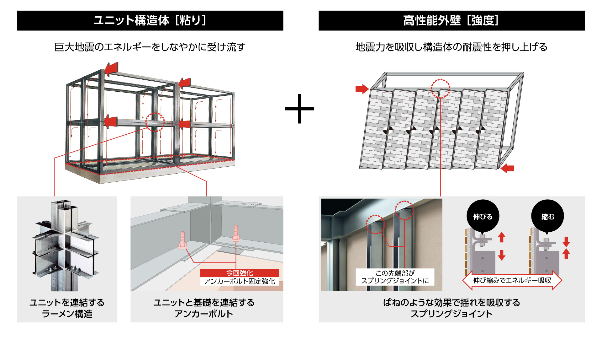 当社は、巨大地震時にエネルギーを構造全体に分散させ、地盤へとしなやかに逃がす鉄骨ユニット構造体と、接合部と外壁パネル間で地震エネルギーを吸収して、建物の揺れを軽減する高性能外壁を組み合わせた独自のハイブリッド耐震システム「GAIASS」を従来、標準採用してきました。