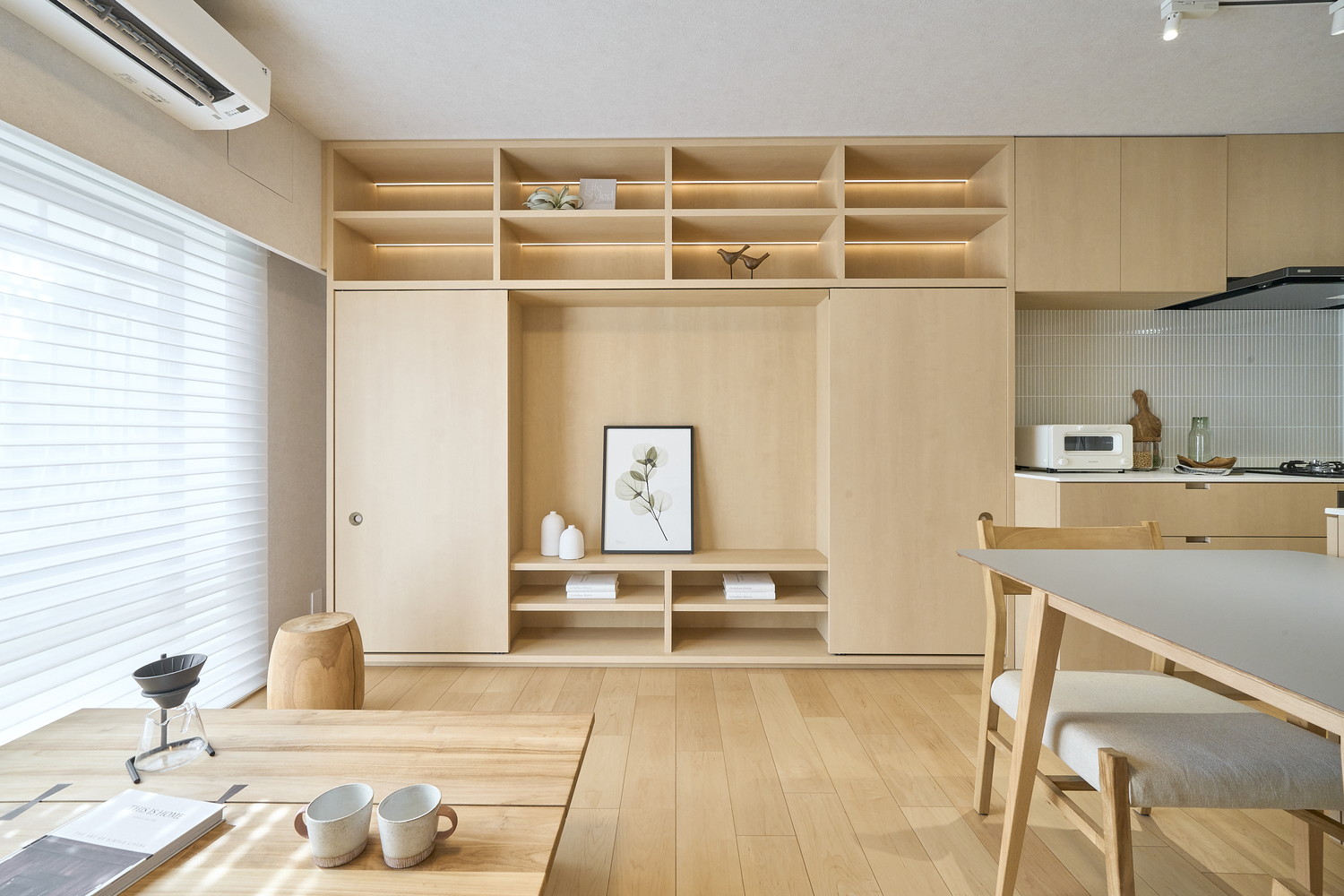 限られた空間で気持ちよく過ごしていただけるように、実際の暮らしをイメージし適材適所の収納を意識して設計しました。キッチンと造作収納はかなりボリュームがあるので、圧迫感なく軽やか広く見えるように素材や納まり、照明の器具や配置も検討しました。かなりの収納力のあるお部屋である一方、見える収納として使える部分もたくさんあるので、趣味や季節の飾りなどで楽しんで暮らしていただければうれしいです。色については、エリアに合わせて和モダンとのリクエストがあったので、コンパクトな空間でも取り入れやすい、明るめの木目を中心に素材感の合うタイルや布製品をセレクトしました。既製品も組み合わせながらの色味合わせはじっくりと慎重に行いました。