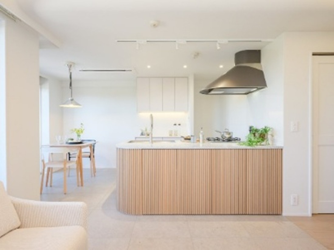 借景の緑を感じられるリビングになるよう、リビングと洋室を区切っていた壁を取り払い、ひとつなぎのLDKに間取り変更。もともと独立していたキッチンは、リビングダイニングを見渡すことができるオープンキッチンに変更し、前面はリブ材と曲線が美しいデザインに。