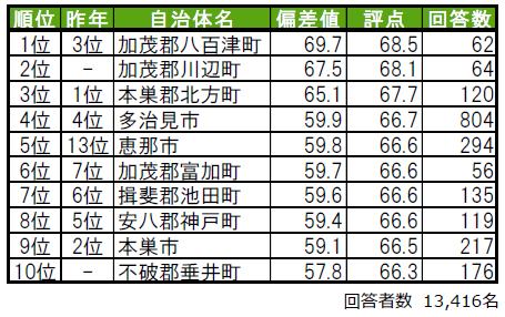 1位は昨年3位から順位を上げた八百津町、2位川辺町(昨年は偏差値50未満のため順位非公開)で、トップ2は加茂郡に属する町という結果になっています。3位は本巣郡北方町です。その他、昨年から順位を上げてトップ10入りしたのは、5位の恵那市(昨年13位)、10位の不破郡垂井町(昨年は偏差値50未満のため順位非公開)です。トップ10のうち7自治体が、郡部に属する「町」という結果になっています。
