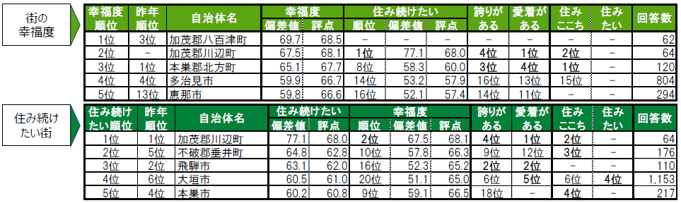 街の幸福度は、1位加茂郡八百津町、2位加茂郡川辺町、3位本巣郡北方町。