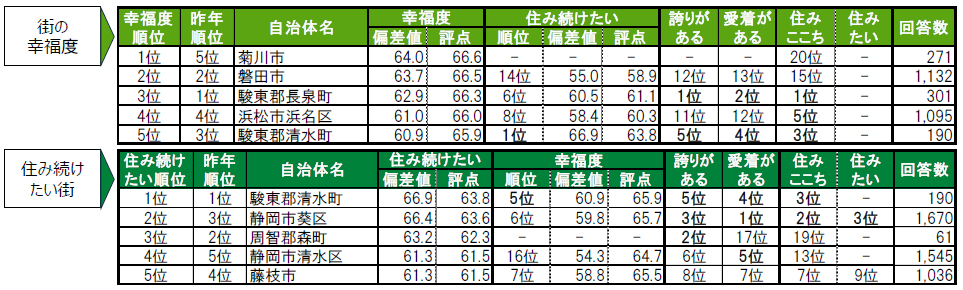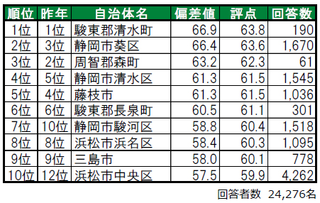 駿東郡清水町が、2年連続で1位に輝きました。2位は昨年3位から一つ順位を上げた静岡市葵区、3位は周智郡森町です。