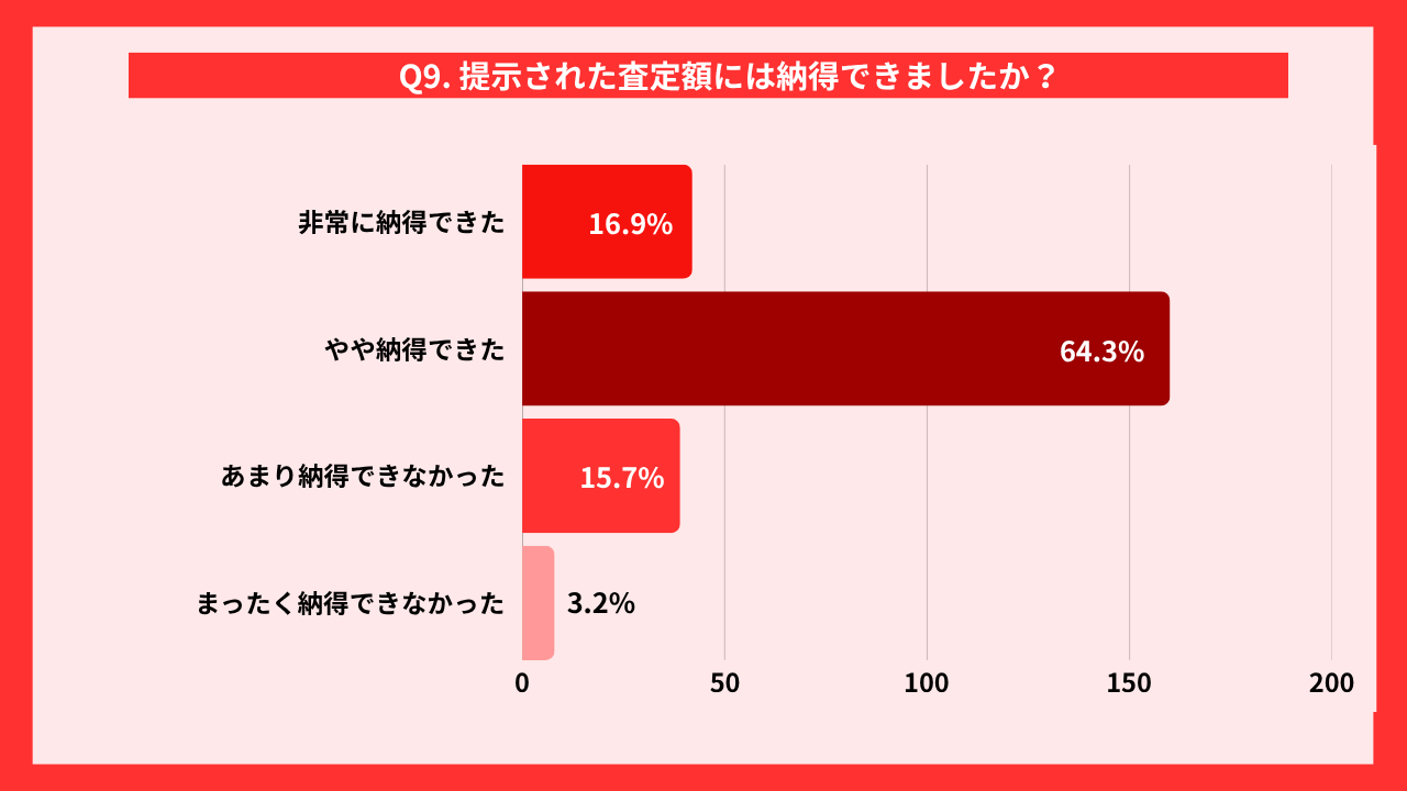 提示額への納得しているユーザーは、「非常に納得できた」(16.9%)と「やや納得できた」(64.3%)を合わせると、全体の8割強にのぼります。また、「全く納得できなかった」という回答は3.2%にとどまり、多くの利用者が査定結果を一定程度信頼できると感じていることがうかがえます。