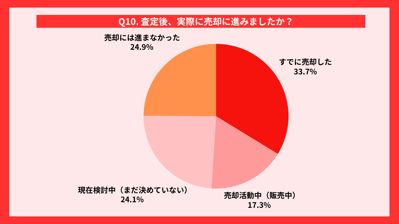 査定後実際に売却したのは、「すでに売却した」(33.7%)、「売却活動中」(17.3%)を合わせると、全体の約半数ほどでした。一方で「現在検討中」(24.1%)、「売却には進まなかった」(24.9%)もあり、簡単に売却の決断には至らないという傾向がうかがえます。